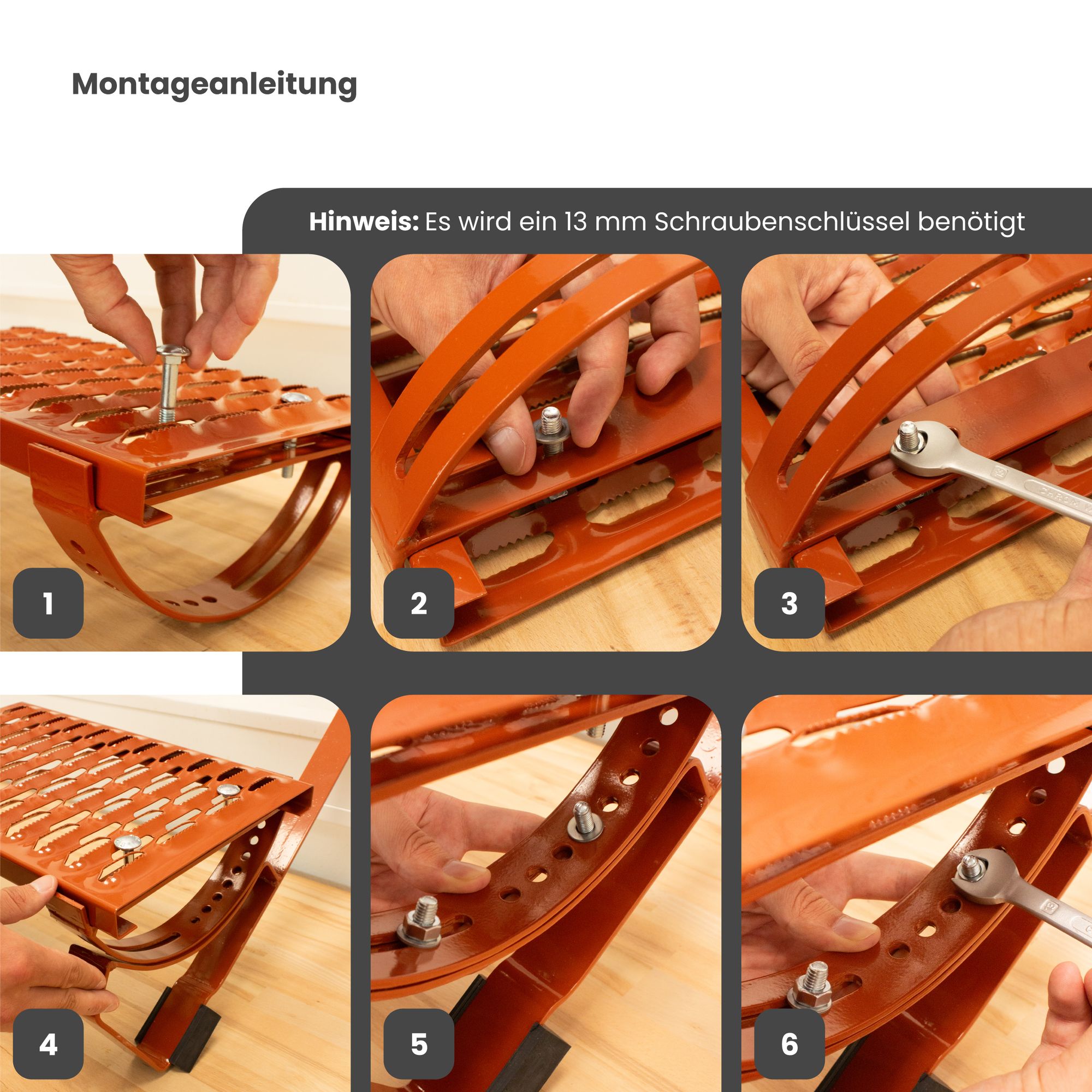 Die Anbringung der Trittstufen erfolgt in wenigen Schritten. Zunächst baust du den Laufrost zusammen, im Anschluss hängst du ihn über dem Ziegel an der Dachplatte ein. Im letzten Schritt überprüfst du mithilfe einer Wasserwaage den waagrechten Linienverlauf.