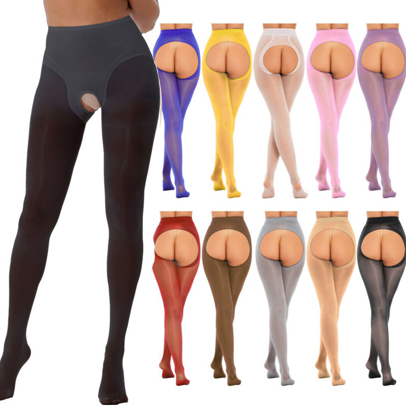 Elastic waistband briefs, open crotch and high cut style, glossy appearance.