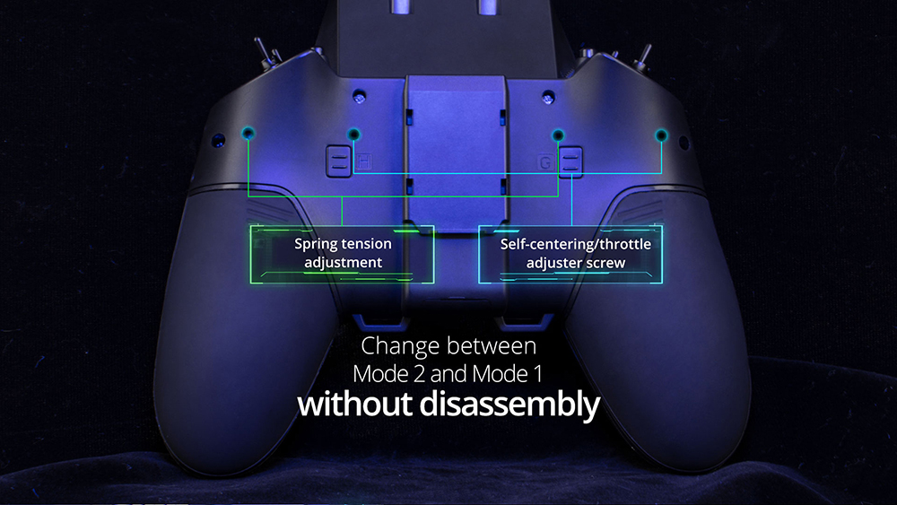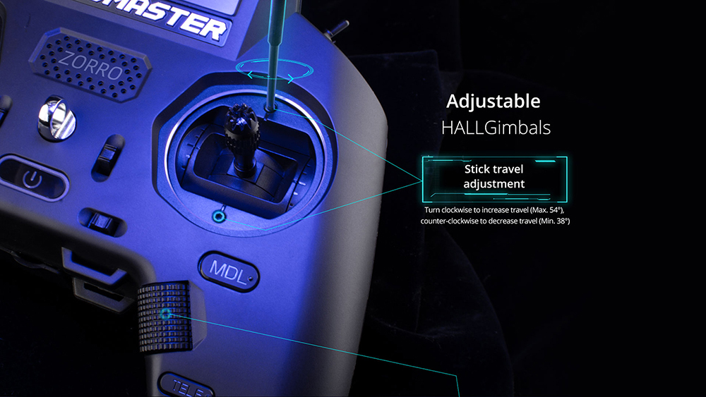 2.RC Radio Transmitters Mode: Change between Mode 2 and Mode 1,Without Disassembly ;Adjustable Hall Gimbals--Turn clockwise to increase travel(Max.54°)Counter-clockwise to decrease travel(Min.38°)