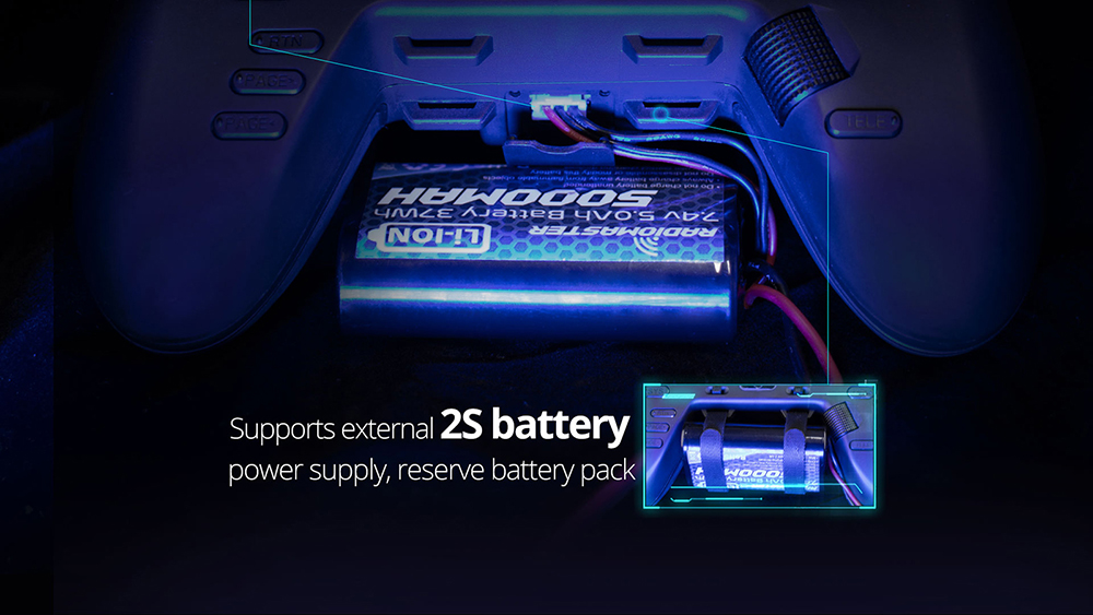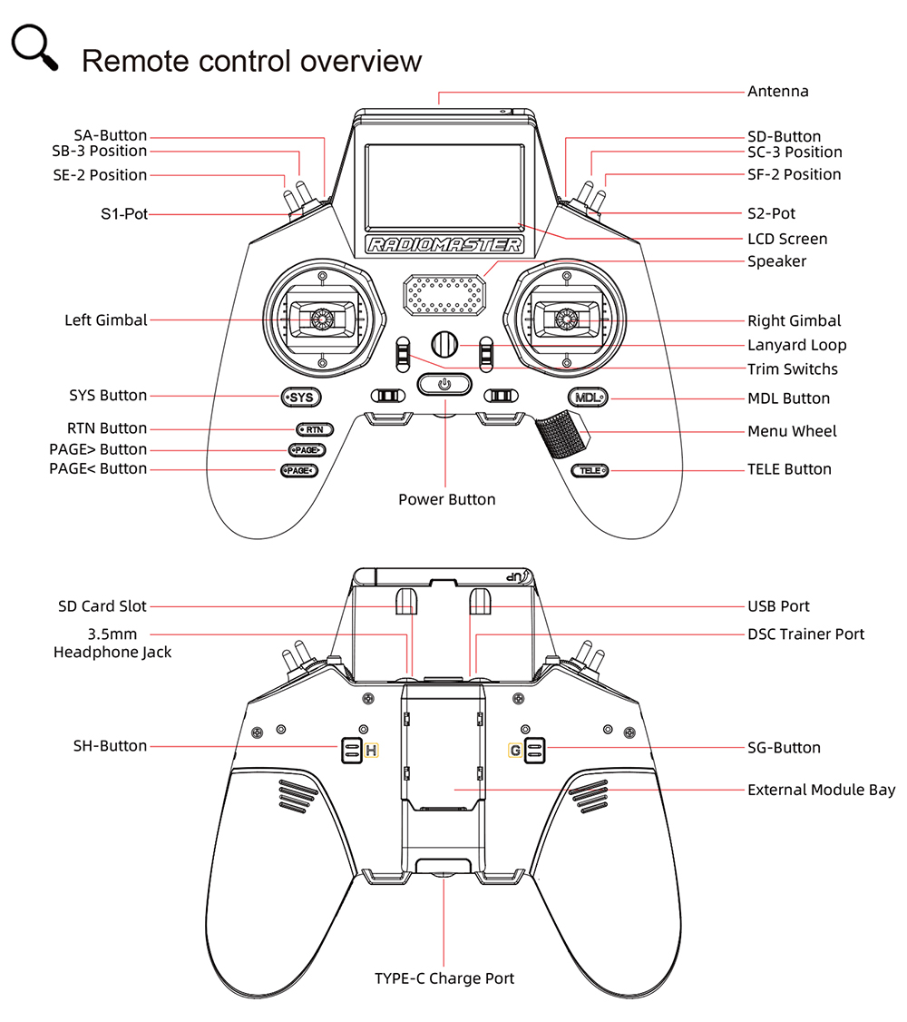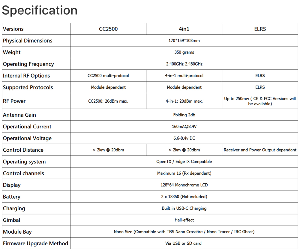 5.Charging Mode: 18350 battery compartments,supports USB-C direct charging,Supports external 2S battery power supply,reserve battery pack,Foldable antenna,Audio output,DSC port,SD card slot,USB port. DIY attachment points,Aux buttons.External Module bay for use with Crossfire/ELRS and other compatible modules