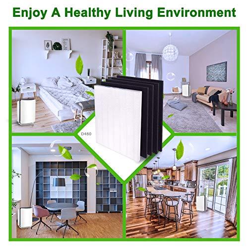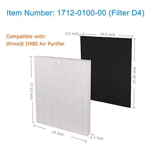 This premium high-efficiency True HEPA Replacement Filter Set (Filter D4, Item number 1712-0100-00) is a complete one-year filter set and fully compatible with *Winix D480 Air Purifier. This True HEPA Filtration system contains the following filters: -(4) Activated Carbon Filters: Traps larger particles in the air like dust, hairs, pet fur and lint, prolongs the life of the true HEPA filter, and absorbs household odors from pets, cooking, smoking, wildfire, and harmful VOC’s -(1) Premium H13 Grade True HEPA Filter: Captures % of airborne particles down to 0.3 microns in size, creating fresh and purified air for you and your family Fully Compatible with the following air purifiers: -Winix D480 Air Purifier Using high efficiency air purifier filters and replacing the filters regularly will help optimize air cleaning performance. Replace your True HEPA filter every 12 months and Activated Carbon Filter every 3 months for optimal performance. Disclaimer: *Winix is the registered trademarks of the original manufacturers. Any use of Winix brand name and model designation is made solely for the purposes of demonstrating compatibility.