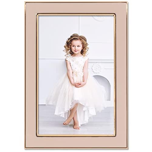 A high quality gold metal frame with polished pink enamel panel. This gold metal and lacquer coated frame has a beautiful lustrous finish. Comes with a high quality black velvet backing with an easel for vertical or horizontal table top display, and hangers for vertical or horizontal wall mounting. Heavy weight metal picture frame is made with exceptional workmanship and comes individually boxed.
