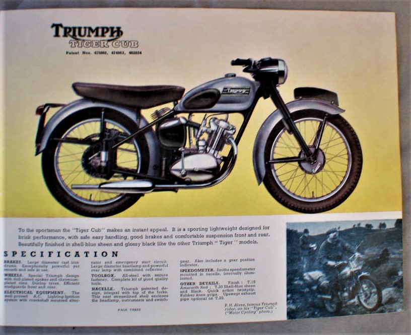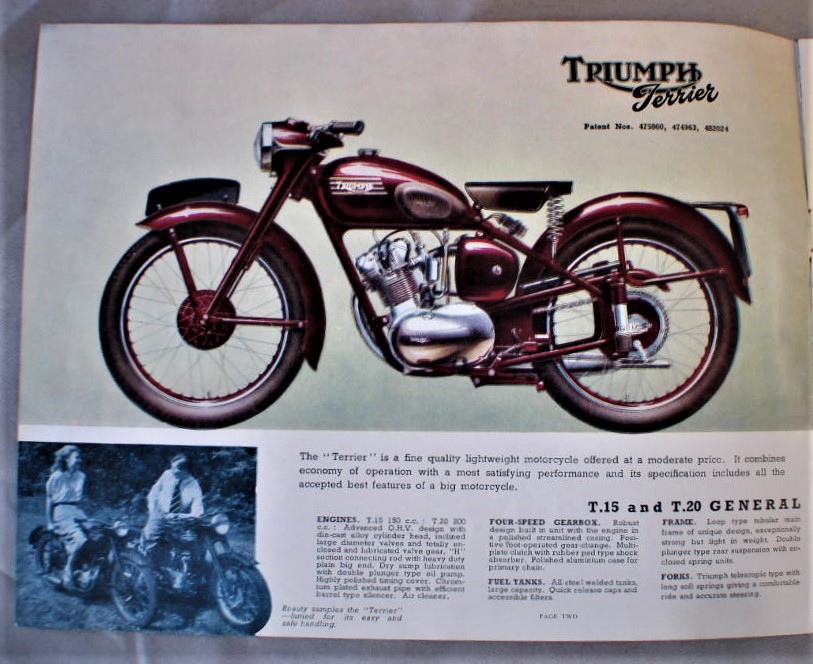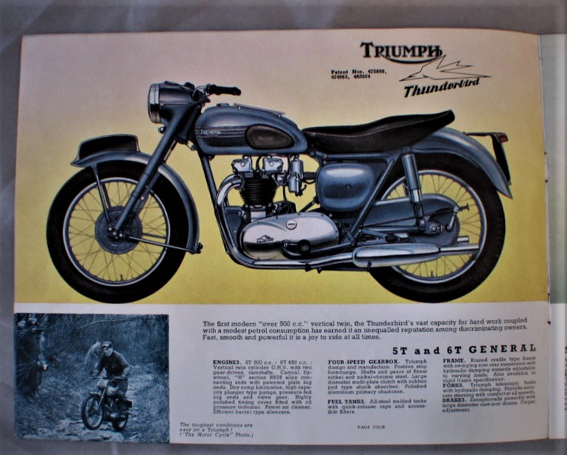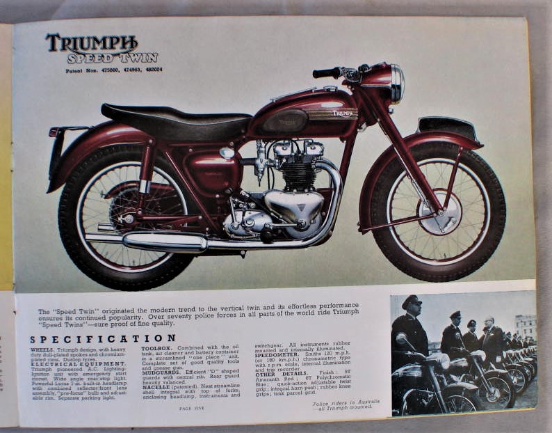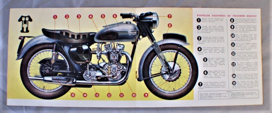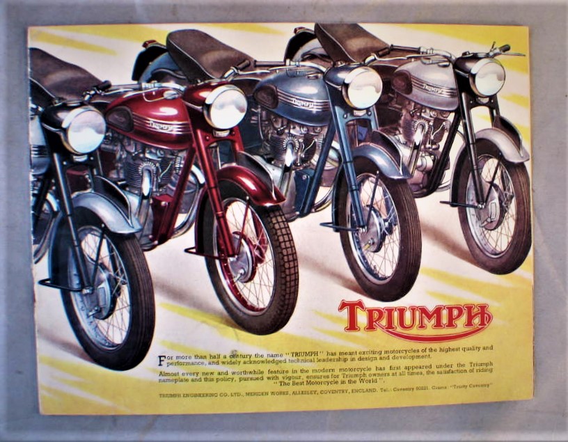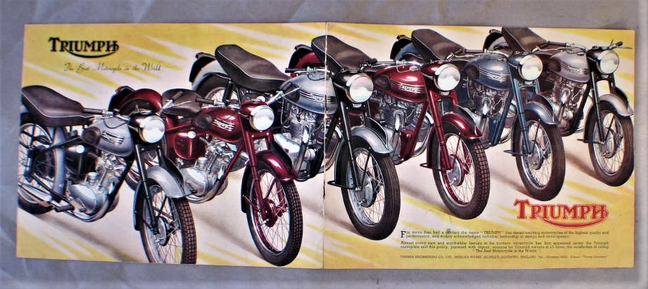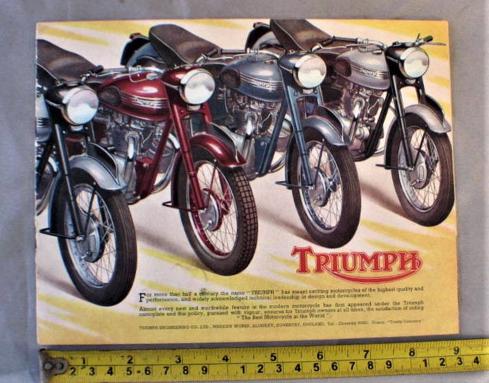 Vintage 1954 Triumph Motorcycle Advertising Brochure... Cover has illustration of 4 motorcycles fully open all 6 models are shown... Brochure has about 11 pages of information... Illustrations, and a specification chart ; for all 6 models... Brochure is in very good condition, cover has 3/4" split along the bottom of the spine... Brochure measures about 9 1/8" x 7"