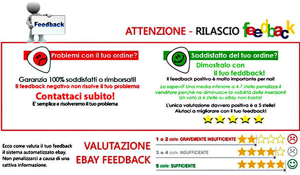 La nostra assistenza clienti disponibile tramite messaggi EBAY da lunedi a sabato, 9.00-18.00