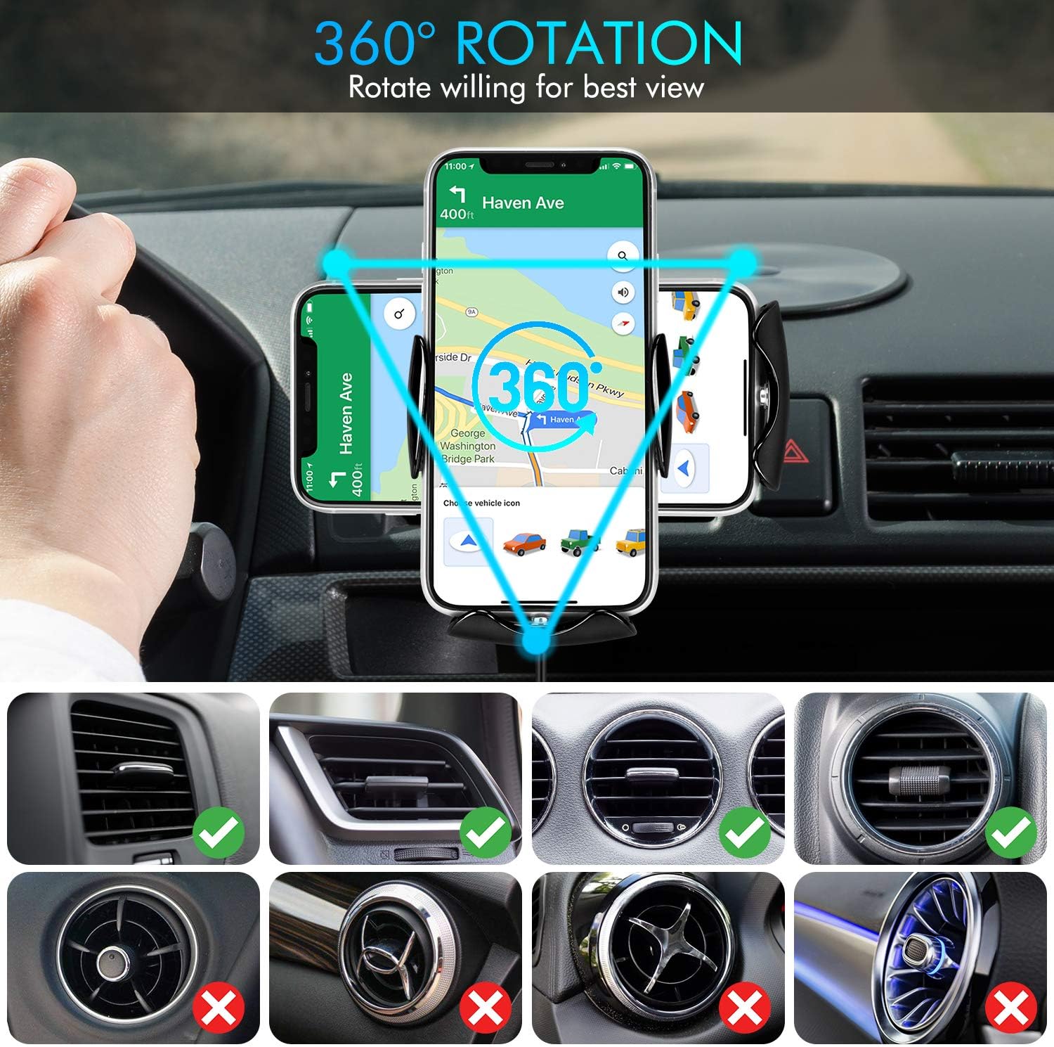 【Case Friendly】The wireless car charger can charge for all phones with phone cases(thickness≤5mm), no need to remove the phone cases. Please note that keep away from metal fittings to ensure charging efficiency. 360° rotating ball helps you to find the most suitable angle for safe driving.