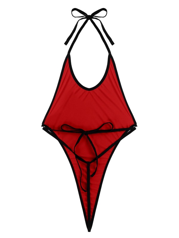 Glossy bodysuit, solid color, round neck, sleeveless, high cut design, backless.
