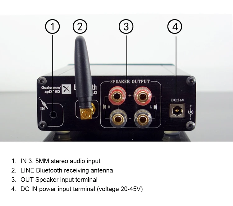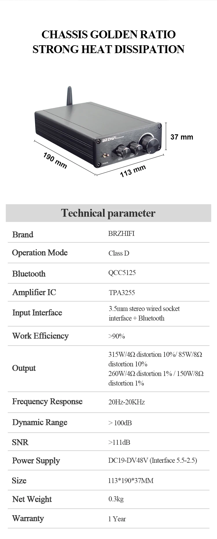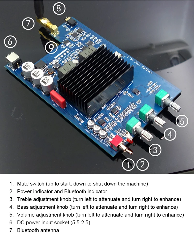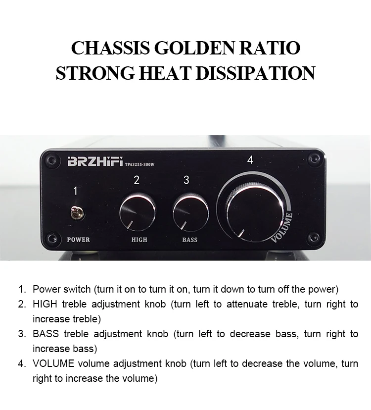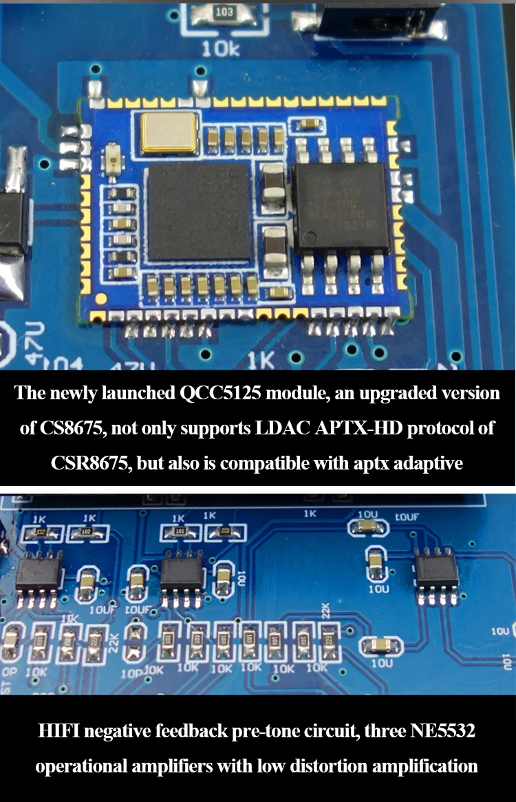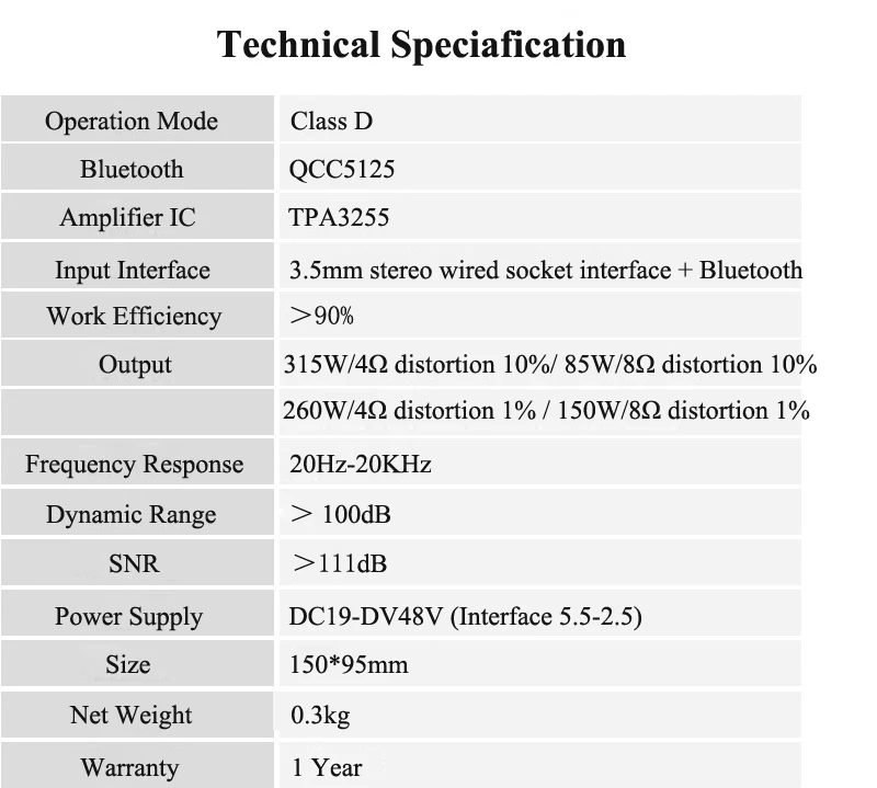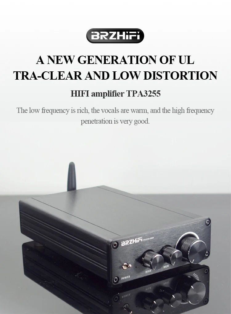 This product is designed for the most discerning and feverish musicians. It integrates the current very low distortion TPA3255 power module and the Bluetooth decoding module QCC5125 that supports LDAC and APTX, and integrates the PCM5102A high-end decoding chip. So the sound feature is: the low frequency is rich, the vocals are warm, and the high frequency penetration is very good. And with 2 high and low bass adjustment, it is very convenient to use.