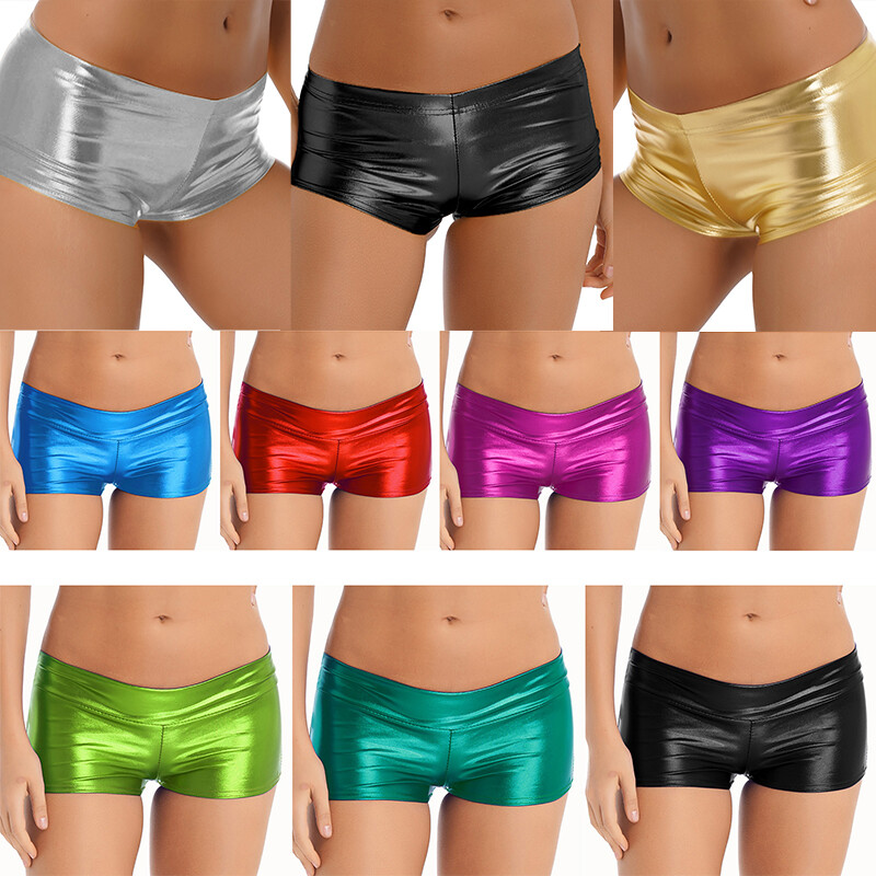 PU leather booty shorts for women, solid color, pull on closure, the triangular design will visually prolong your legs.