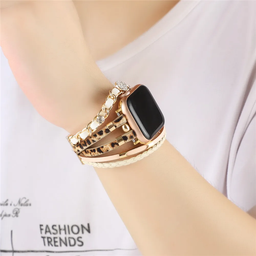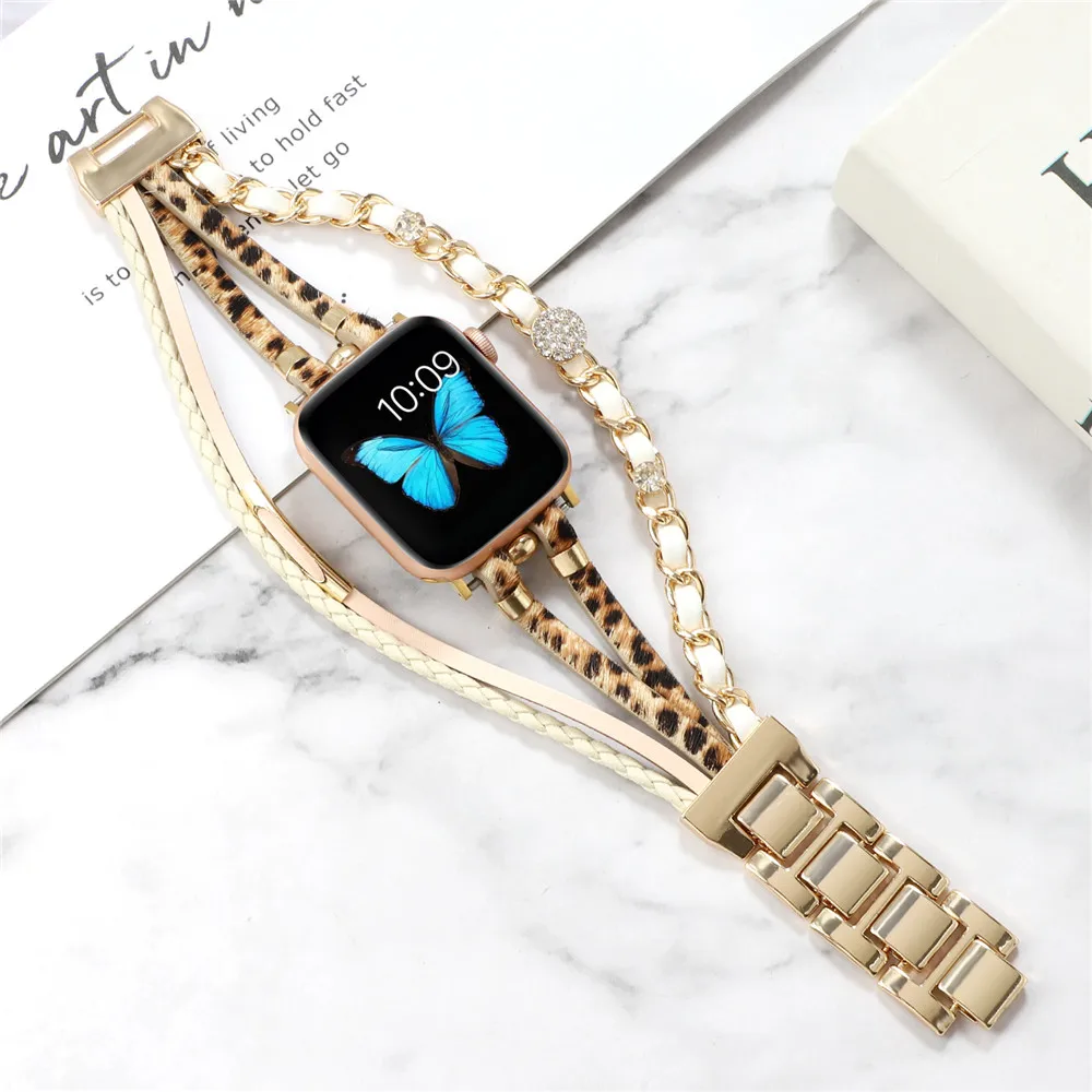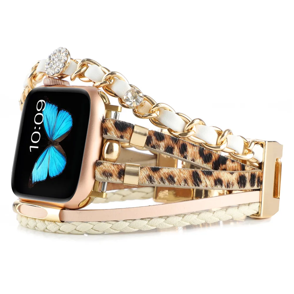 Shine Gems Leather Strap For Apple Watch Ultra 49mm 40 44 42 38 41 45mm Metal Chain Band Leopard PU Faux Leather Strap For iWatch Series 8 7 6 SE 5 4 3 2 1 Replacement Wristbands