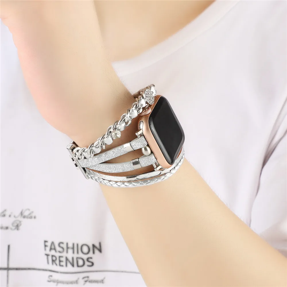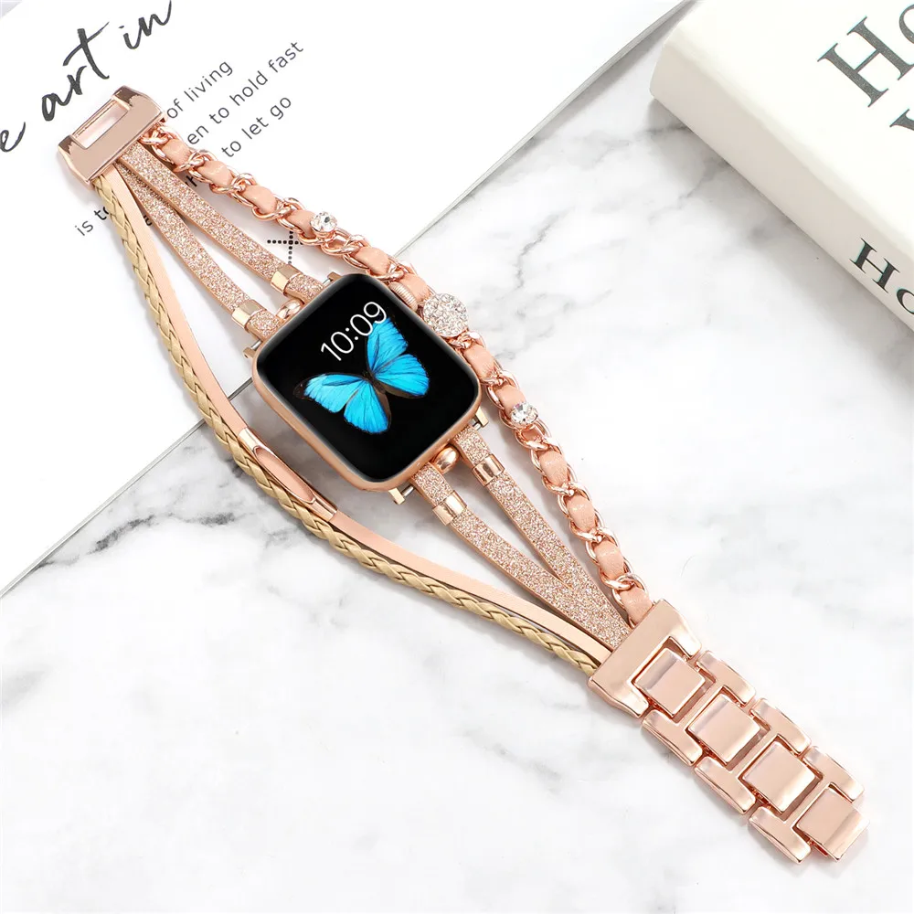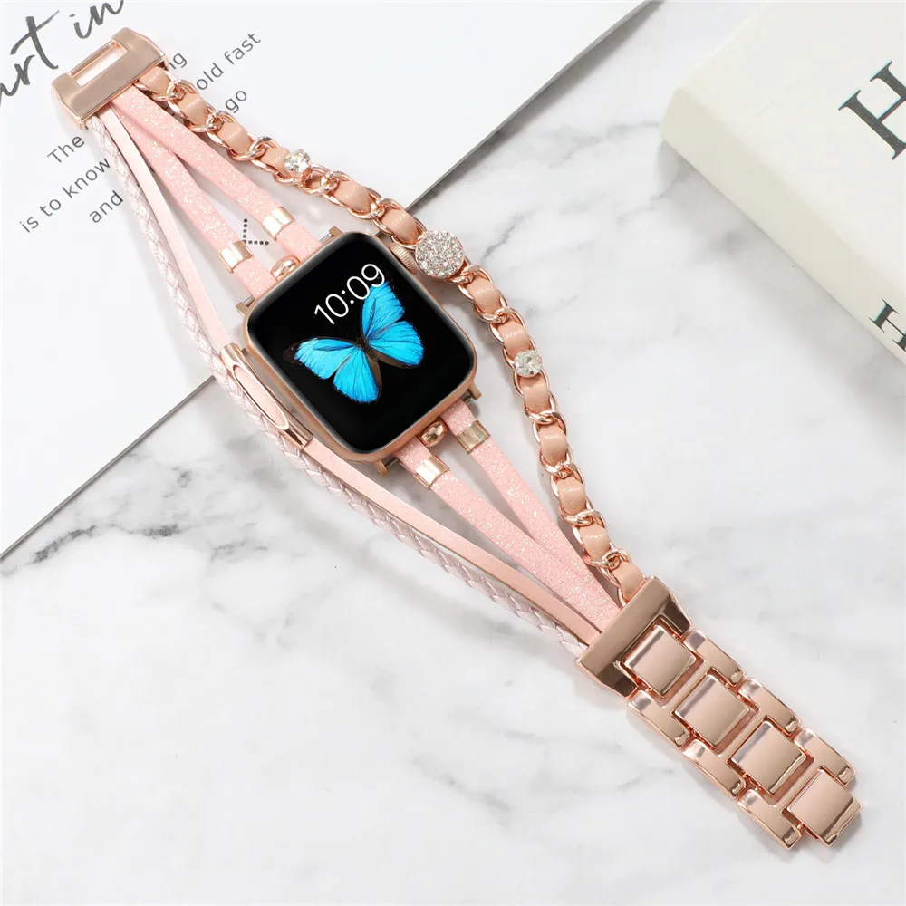 Bling Gems Lederarmband für Apple Watch Ultra 49mm 40 44 38mm Metall Kettenband