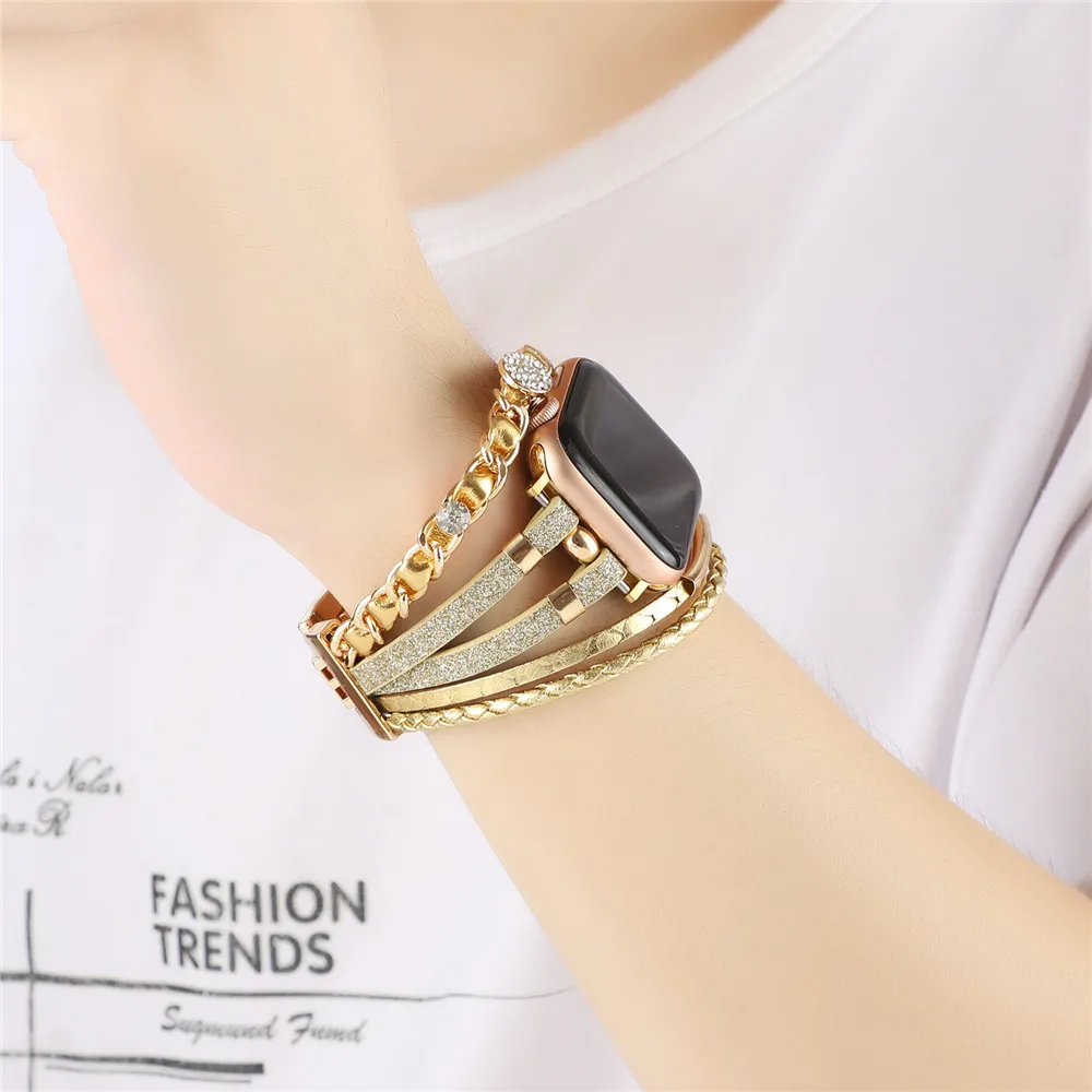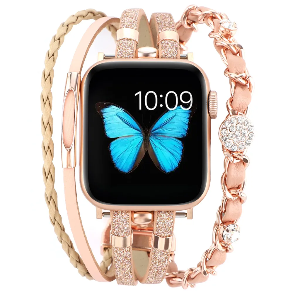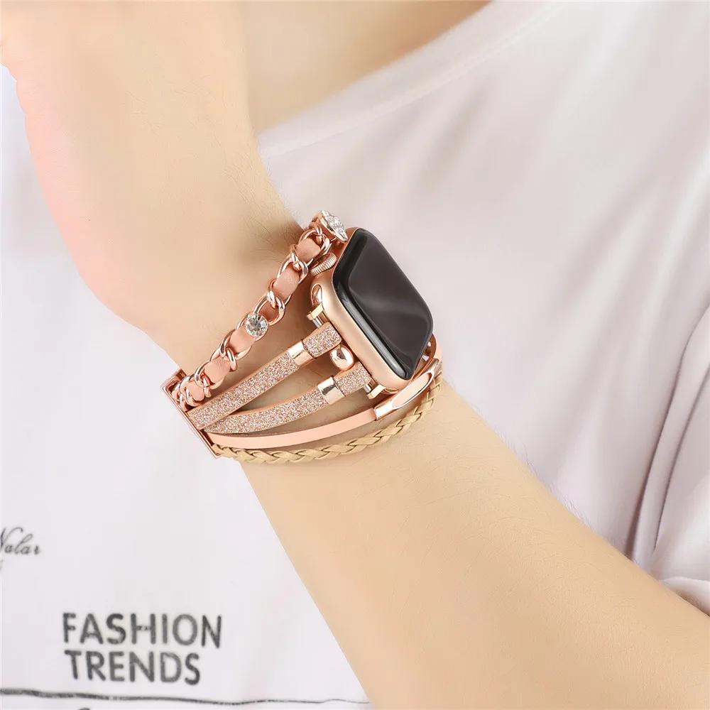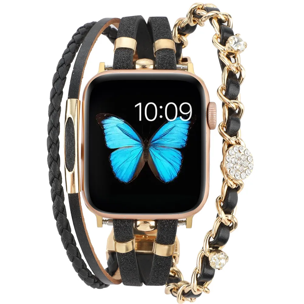 Bling Gems Lederarmband für Apple Watch Ultra 49mm 40 44 38mm Metall Kettenband