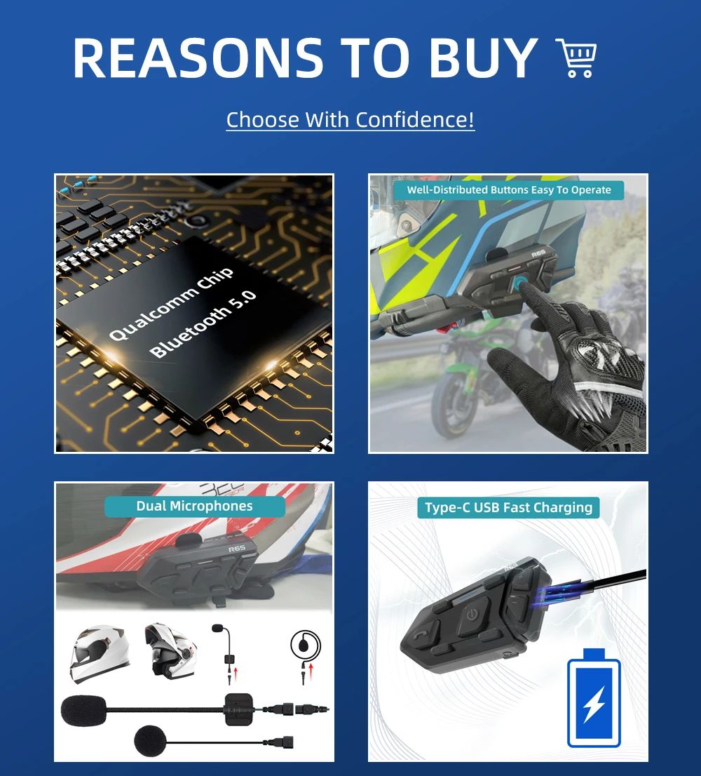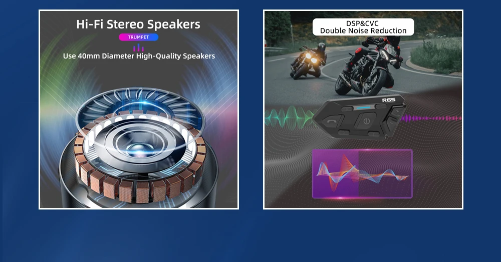 【DSP&CVC Noise Reduction】: R6S motorcycle bluetooth headset Adopt advanced dual noise reduction technology, which can reduce the noise caused by engine and wind by 80%
