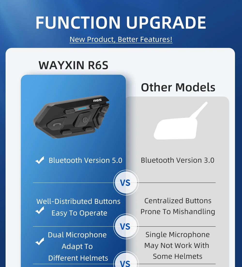 【Appearance Button Design】: WAYXIN R6S helmet headset uses ABS waterproof material overall, the button design is more in line with the actual usage scene, and it can be operated easily even while driving