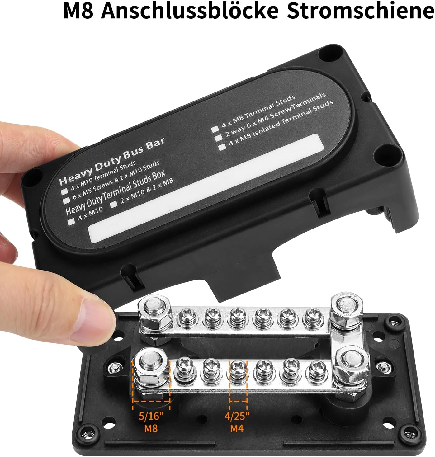 - 2 pieces 4 x M10 bolt bus rails: you will have durable collecting rails are 4 x M10 bolts, you have many connection points for the red positive pole and the black negative pole with 3/8 inch holes, modular box design, removable for easy wiring configuration
