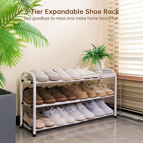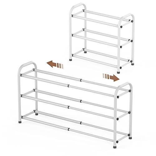 Expandable Shoe Rack:This 3 tier shoe rack can be expanded up to 33.8" and holds up to 12 pairs of adult shoes. Great Solution for shoes organization of garage,entryway,bedroom,and small place.