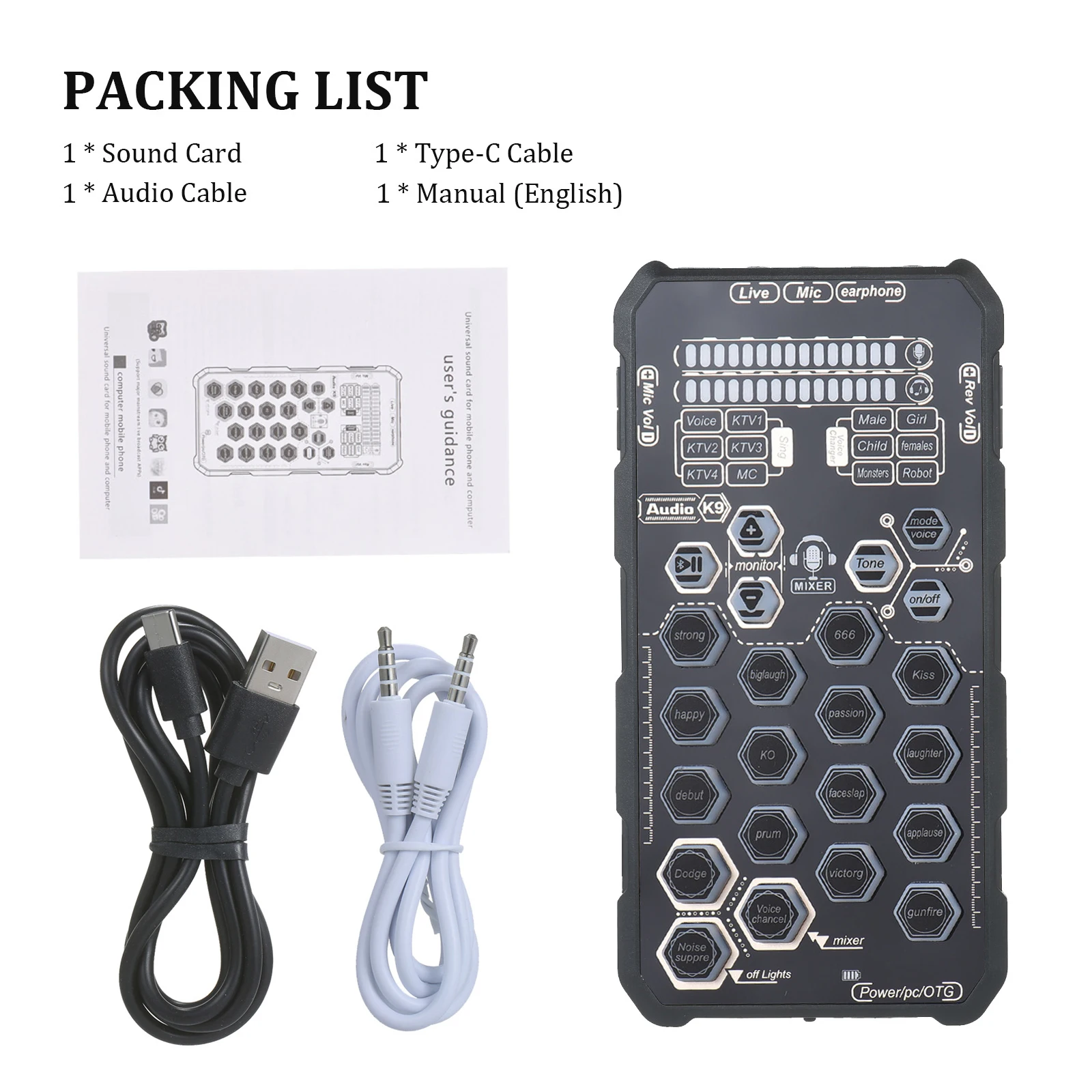- Equipped with charging cable, audio cable, and BT function, the sound card compatible with both mobile phone and computer.