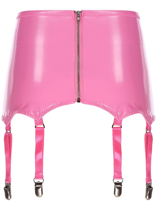 Wet look patent leather garters with metal clips keeps stockings from slipping.