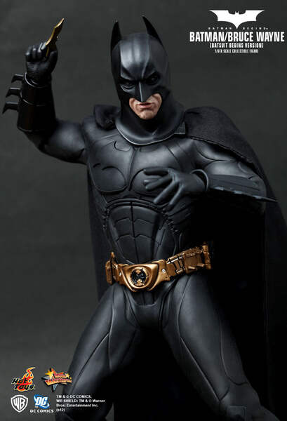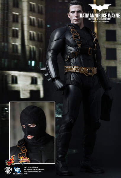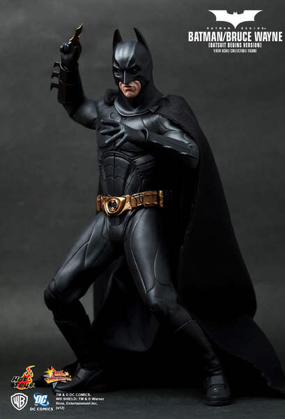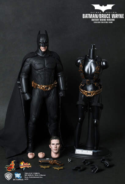 Hot Toys is proud to present the 1:6th scale Batman - Bruce Wayne (Batsuit Begins Version) Collectible Figure, from the classic Batman Begins. The Batman-Bruce Wayne collectible figure is highly detailed and specially crafted based on the image of Christian Bale as the iconic character Bruce Wayne, highlighting the detailed head sculpt, costume, weapons and accessories.The 1/6th scale Batman / Bruce Wayne (Batsuit Begins Version) collectible figure features:Authentic and detailed likeness of Batman / Bruce Wayne in the Batman Begins movieTwo interchangeable heads with one Batman head and one newly developed head sculpt of Christian Bale as Bruce WayneSpecially sculpted neck with detailed skin texture to match with the head sculptBatman head with three interchangeable lower part of facesSeven pieces of interchangeable gloved hands including:- One pair of relaxed hands- One pair of fists- One right hand for holding gun- One right hand for holding batarang- One left hand for holding bombCostume:One Batsuit with capeOne detailed utility belt with cell phone and accessoriesOne pair of forearm gauntletsOne pair of black bootsWeapons:One Grapnel gunOne bombTwo batarangs on belt clip (removable)Accessories:One set of full gear climbing harness and beltOne Ninja mask for wearing on the head sculptFigure stand with Batman / Bruce Wayne nameplate and the movie logoToy Fair ExclusiveMMS155Double Boxed for Shipping!