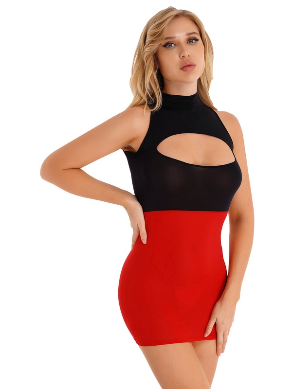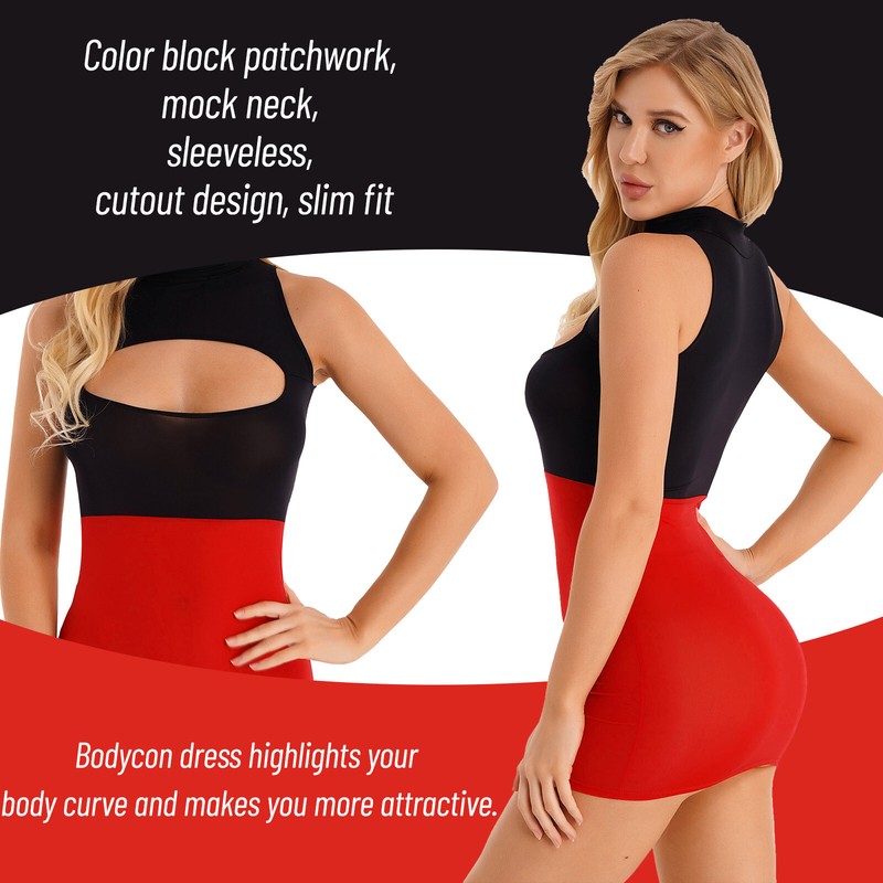 Color block patchwork, mock neck, sleeveless, cutout design, slim fit.
