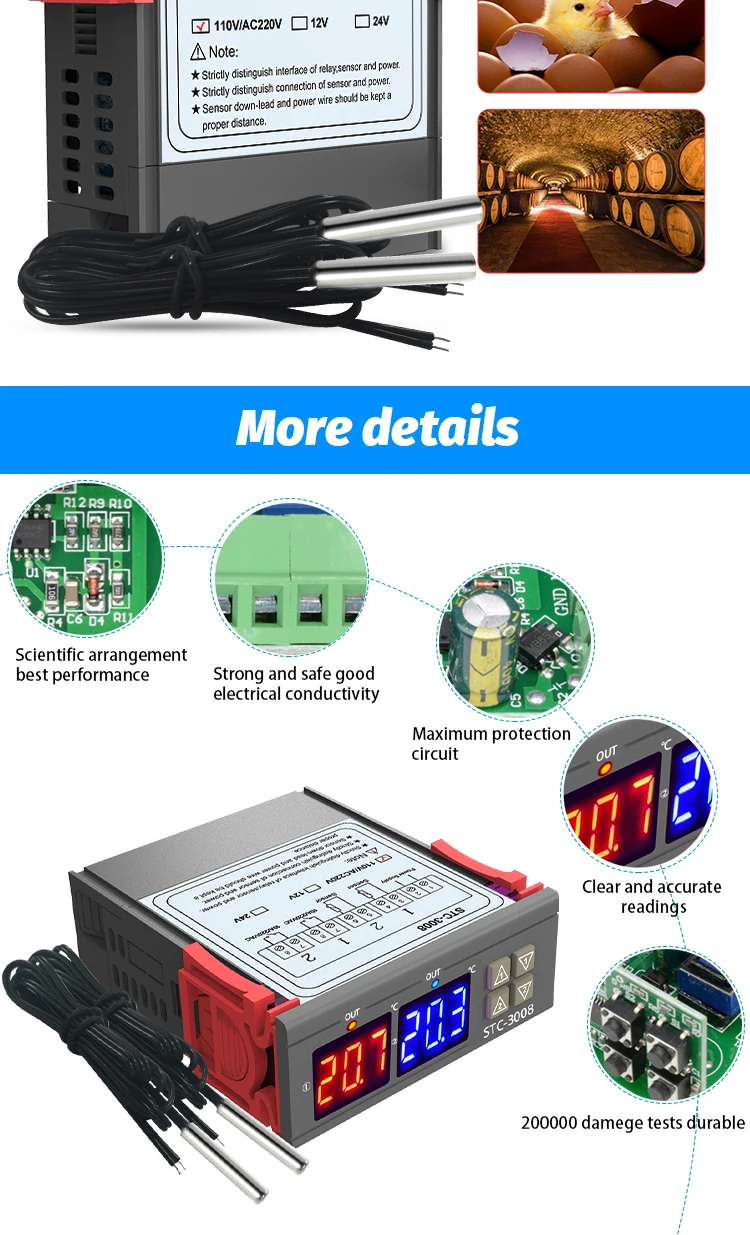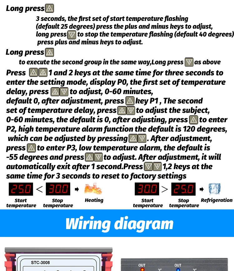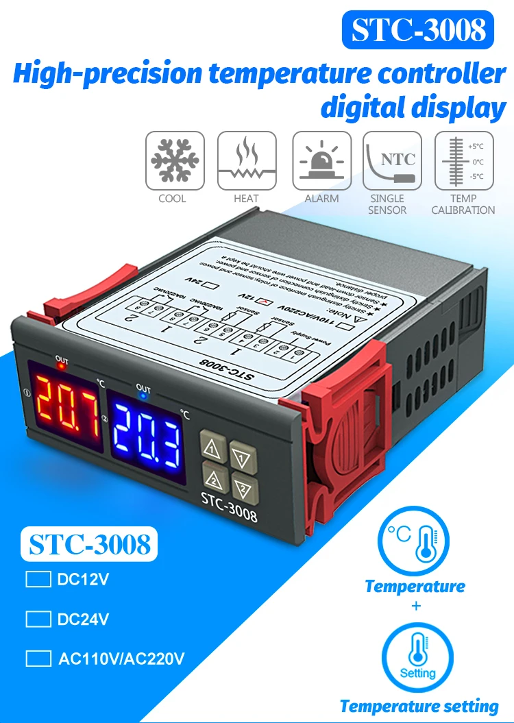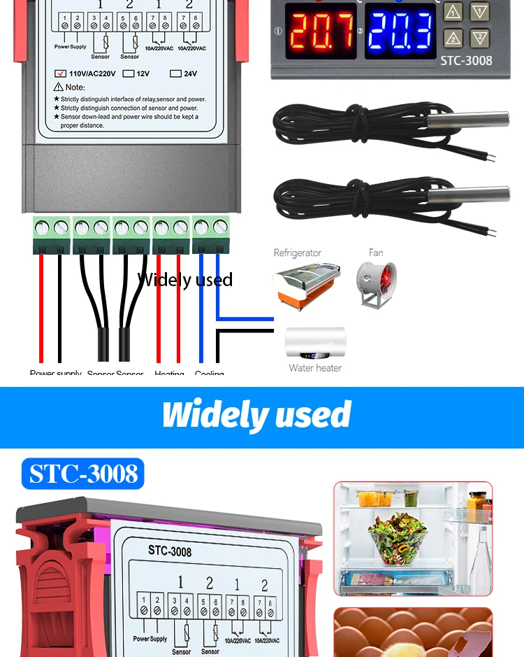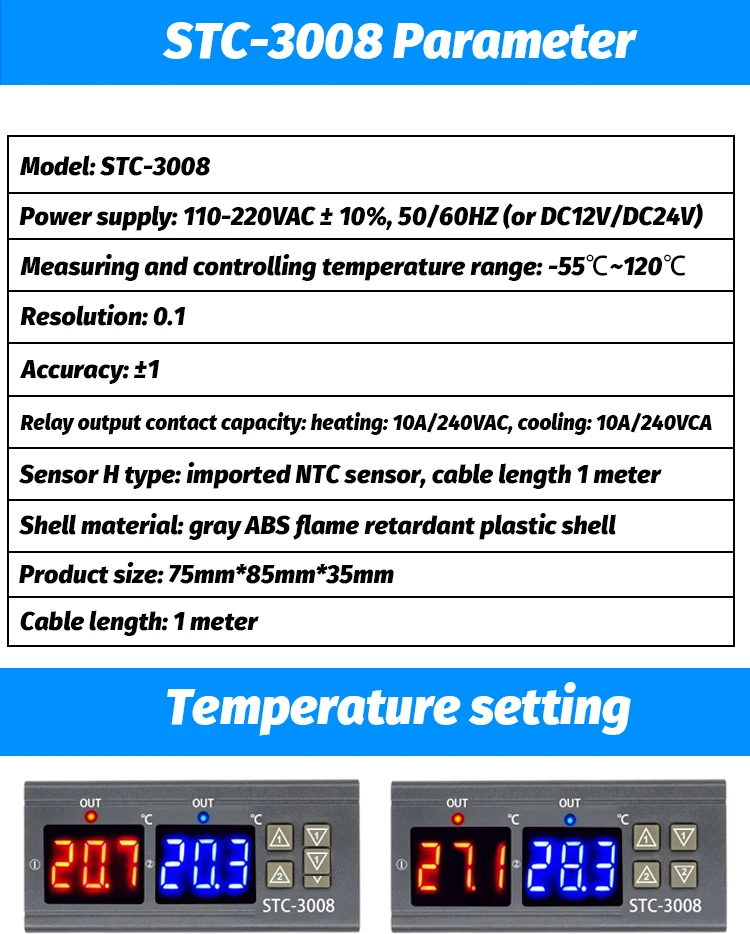 Specifications: Power supply: 12VDC, 24VDC, 110V-220VAC Temperature control range: -50 ~ 120 °C Resolution Ratio: 0.1°C(-9.9-99.9); 1 °C (other range) Measurement accuracy: ±0.1 °C Control accuracy: 0.1 °C Update rate: 0.5S Sensor1 2: NTC10K waterproof sensor each Output 1 2: max. 10A direct output each Environmental requirements: -10-60 °C, humidity 20%-85% RH Size: 100mm (length) x 55mm (width) x 32mm (depth) Cut size: 75(L)mm * 55(W)mm M3 screw hole Power consumption: static current: ≤ 35MA, draw current: ≤ 65MA