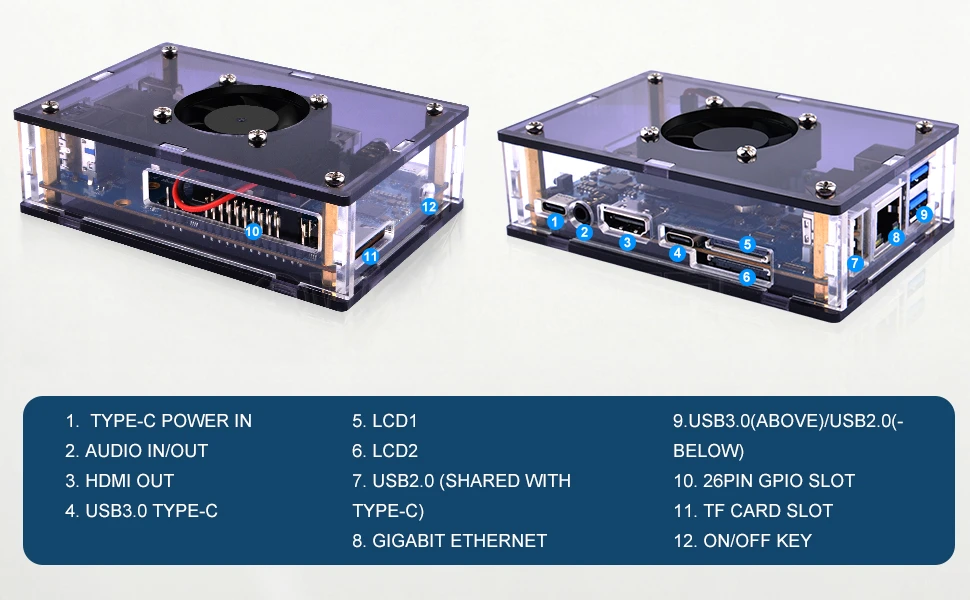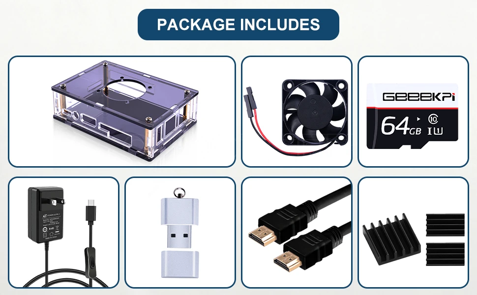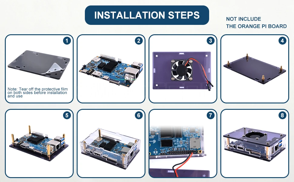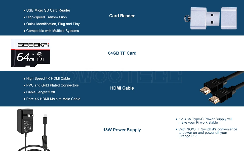This suite is a peripheral package around the OrangePi 5 board, including a card reader, MicroSD card (TF card), power supply, fan, heatsink and HDMI high-definition digital cable. The shell provides good protection and is convenient for installing the fan for cooling, avoiding premature aging of your device due to high load running, while preventing dust from affecting the appearance. The acrylic splicing is also very simple and easy to assemble, and the acrylic fixation is fixed with copper pillars, which is beautiful and generous. The black aluminum alloy heat sink can dissipate heat better with the help of the fan. The high-quality power supply provides enough power for your Orange Pi to avoid some problems caused by unstable power supply, which is a very cost-effective combination in the basic package.