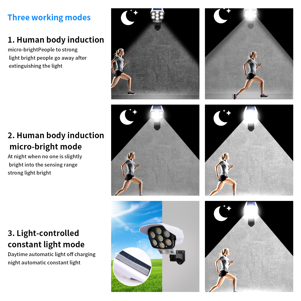 1.2 inch 1 solar safety lamp: Ensure the safety of your family property and keep away from intruders. Featuring 77 bright sports activated LEDs, it has a stylish and low-profile design. More realistic virtual safety lights.