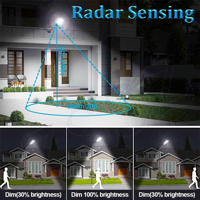 light on when sensing motion, dim light when no motion.When a pedestrian into the induction area:100% bringtness and it will delay 30s.No pedestrian at night:30% brightness.