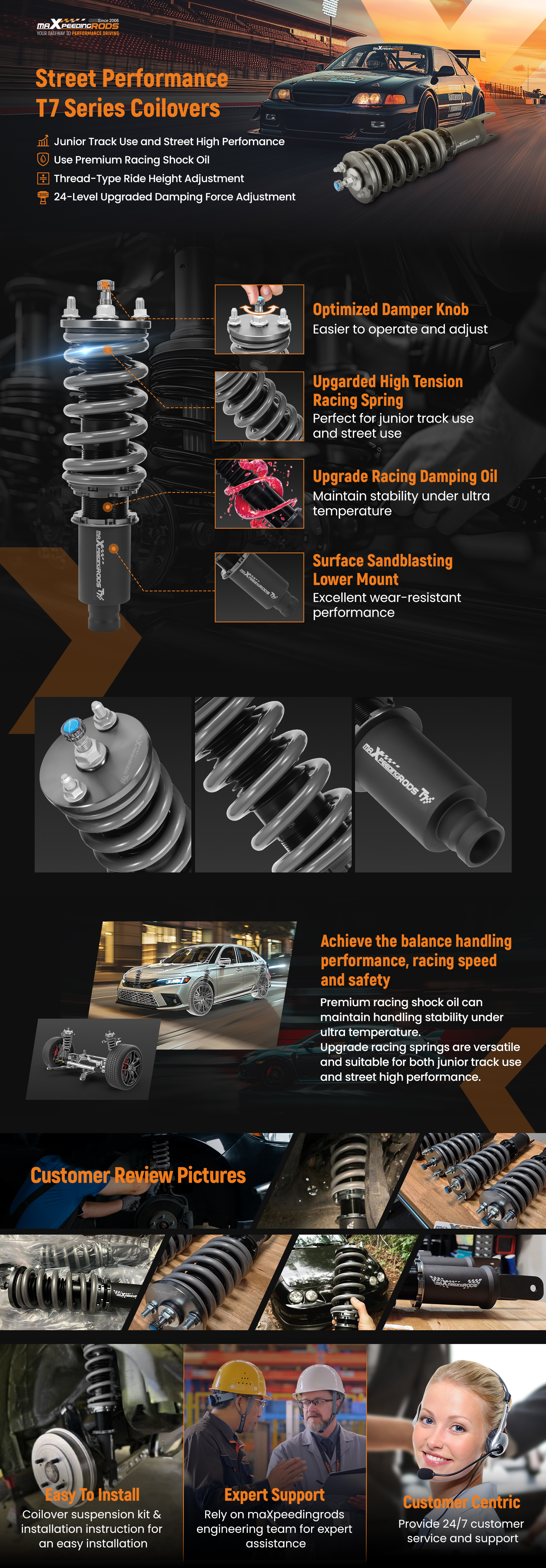 Die maXpeedingrods T7 Gewindefahrwerke sind für den täglichen Straßengebrauch und den Einsatz auf der Rennstrecke (Junior-Klasse) konzipiert. Sie verfügen über Rennsport-Dämpfungsöl, eine verbesserte Rennsportfeder, Höhenverstellung und eine einstellbare Sturzplatte (für einige Fahrzeuge verfügbar), die eine tiefergelegte Optik und ein verbessertes Fahrverhalten bietet.