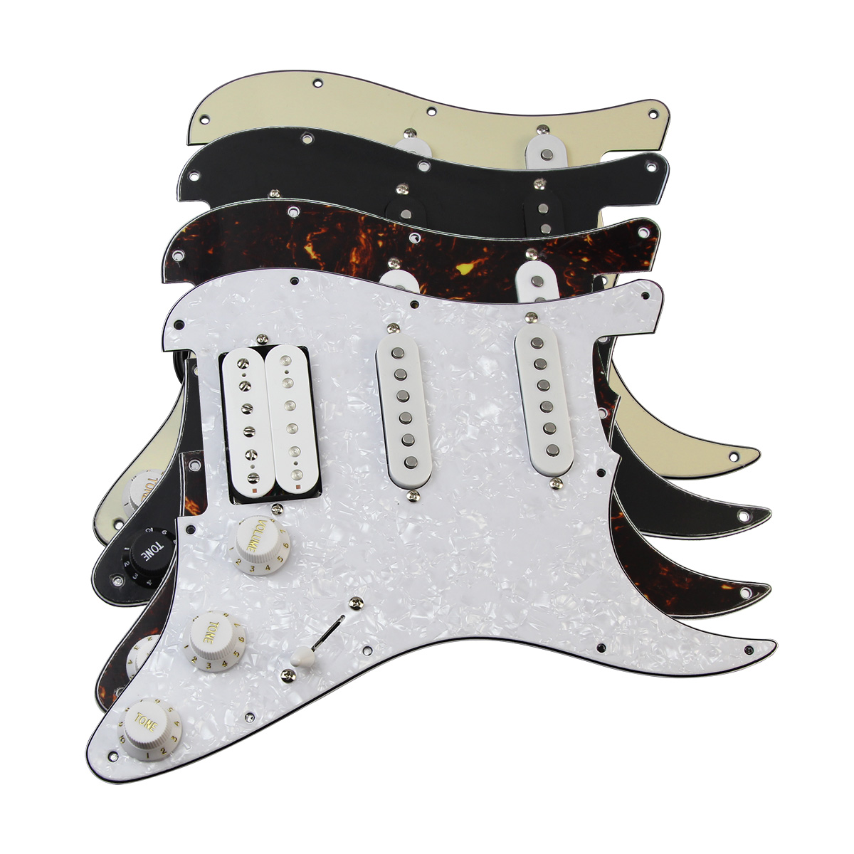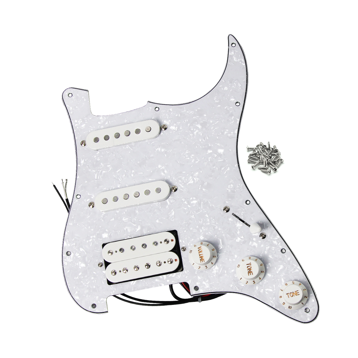 Features: Alnico 5 Prewired HSS Guitar Pickguard Fits for US/Mexico Standard FD ST SSH Style Guitar Parts Replacement. 11-Holes SSH pickguard,backside with big shielding,two layers of protective films on surface. Pre-wiring is complete with 2 single-coil pickups and 1 humbucker pickup with alnico 5 magnet, 2T1V control knobs, 5-way switch. This loaded Pickguard is can't coil splitting version! Single coil pickups feature Staggered pole pieces,middle pickup RWRP (reverse-wound, reverse-polarity) for hum-cancelling. Humbucker Pickup Features 6 Non-Adjustable Slug Pole Pieces & 6 Adjustable Screws Pole Pieces. Resistance: 5-6K (N/M); 14K (B). Pole spacing 50mm/50mm/52mm(N/M/B). Knob & Pots: 2T1V knobs, A500k pots for tone,B500k pot for volume. 5-way switch and 473J 200v capacitor. Included pickguard screws to install, solder your input jack and bridge ground wires,screw in the new guard. Pickguard Color: 4 colors for choose. Package Includes: 1 x SSH Loaded Pickguard 1 x Screws Bag