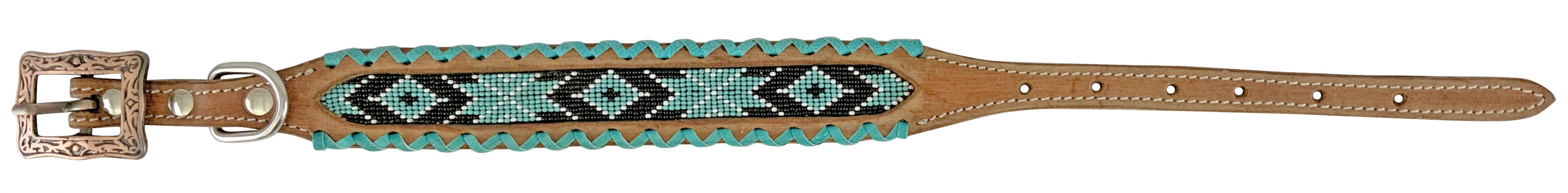 Showman Couture Leather Dog Collar w/ Beaded Inlay & Teal Rawhide. This 1" dog collar features medium leather with teal, white and black Navajo beaded inlay design, teal rawhide wrapped edge and copper hardware. Available Sizes: Small (9 1/2"-13"), Medium (13"-18") and Large (19"-24").