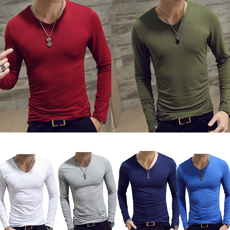 Long sleeve t-shirt for men, v neck, solid color, slim fit.