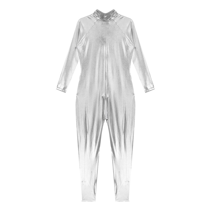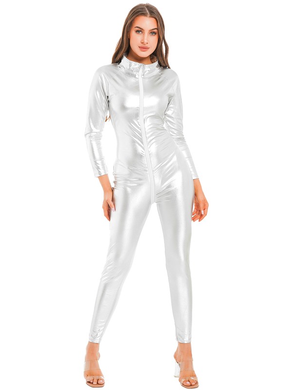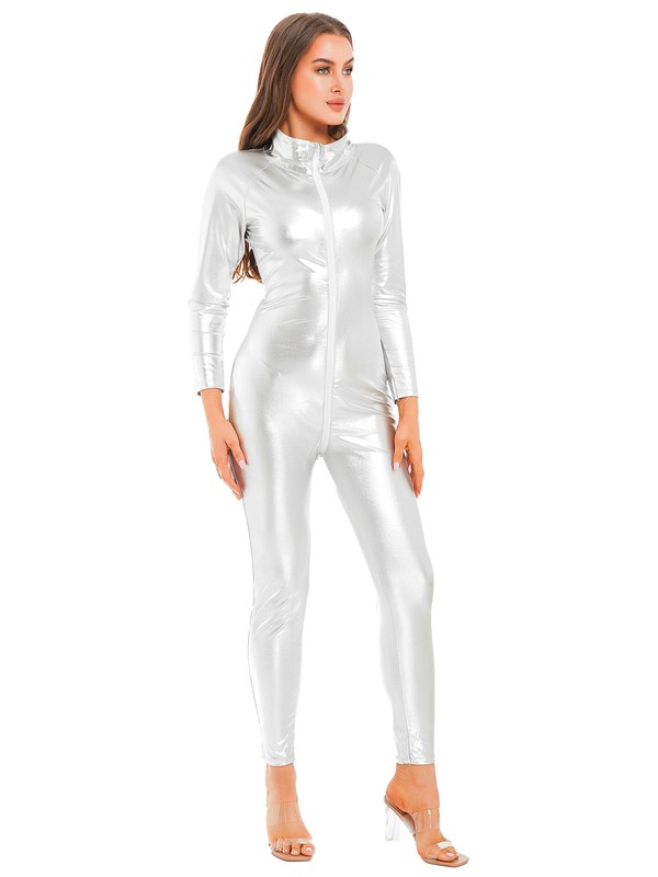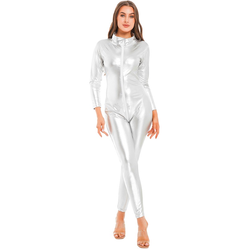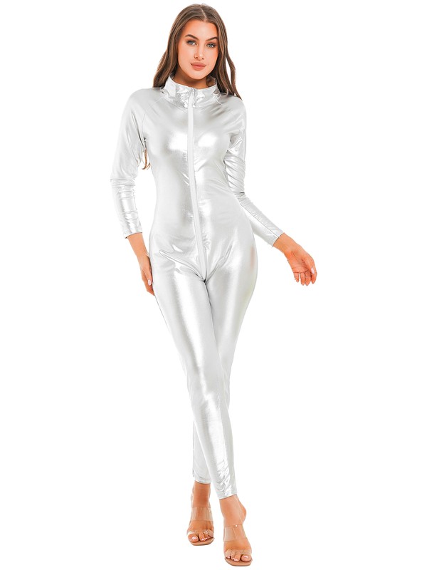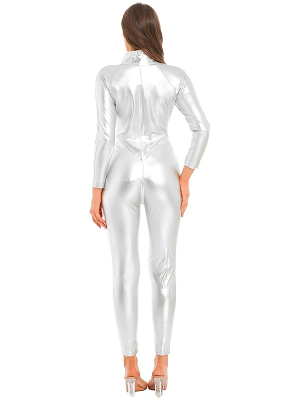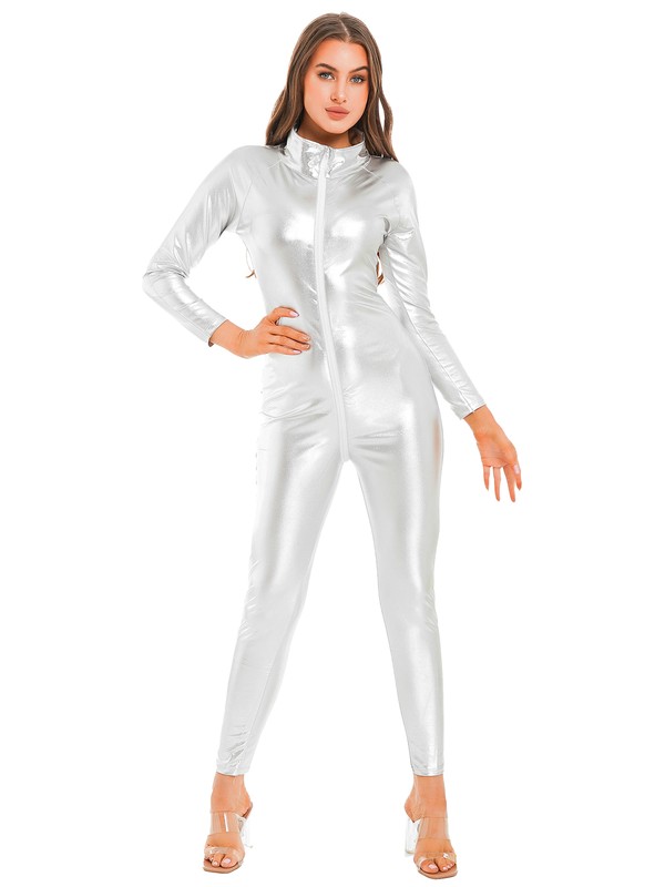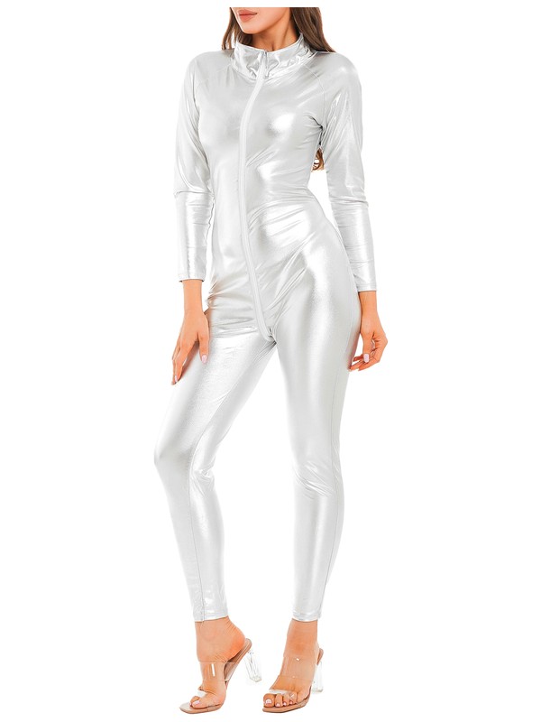 Long sleeve bodysuit for women, stand collar, metallic shiny surface makes you more eye-catching and charming.
