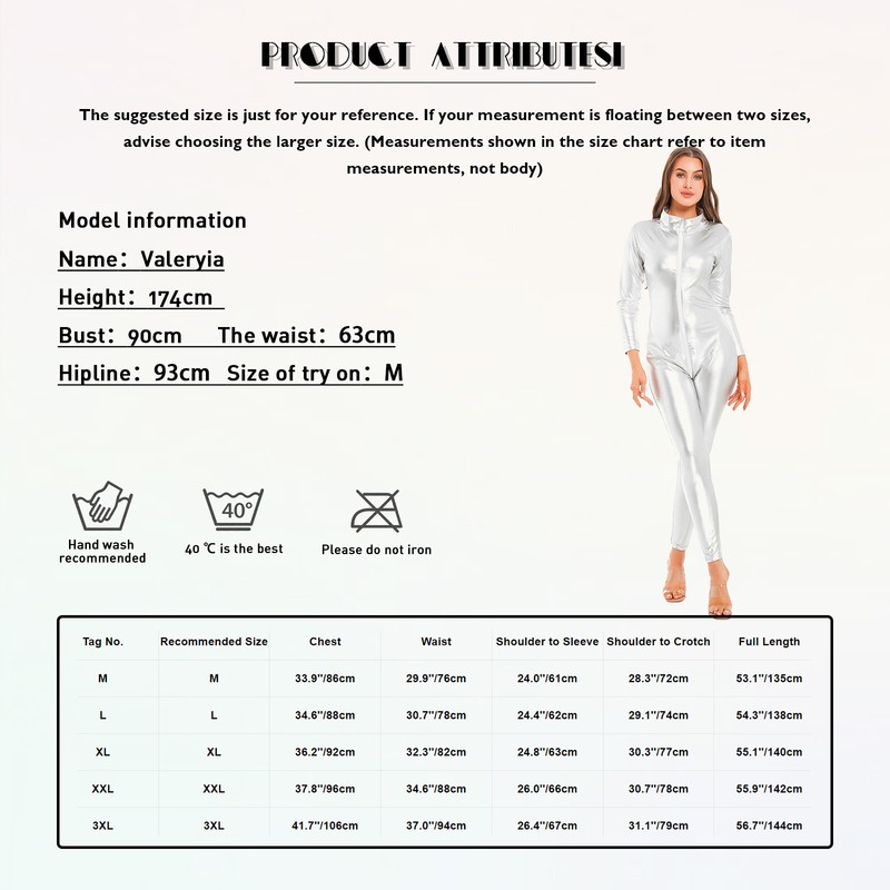 Front zipper closure from neckline to crotch, you can pull the zipper down at the bust for a hot look but not over-exposure.