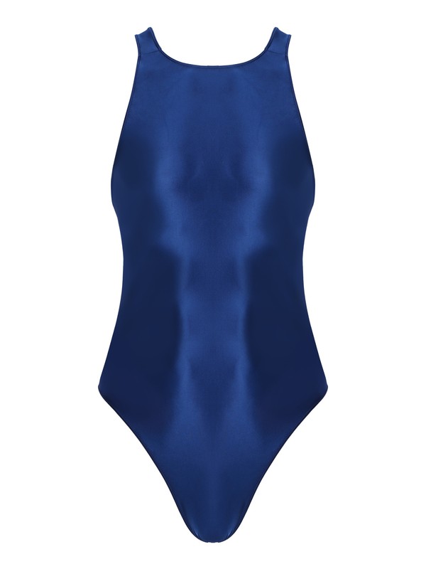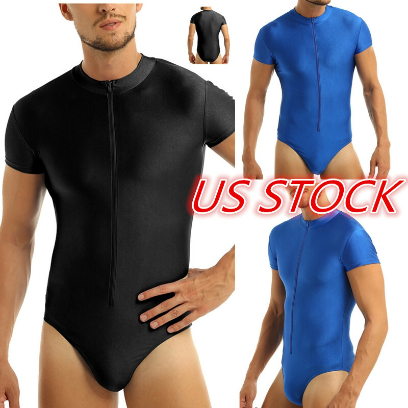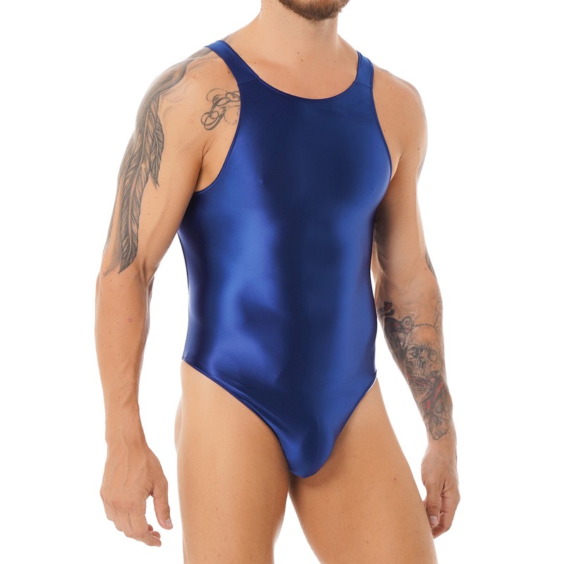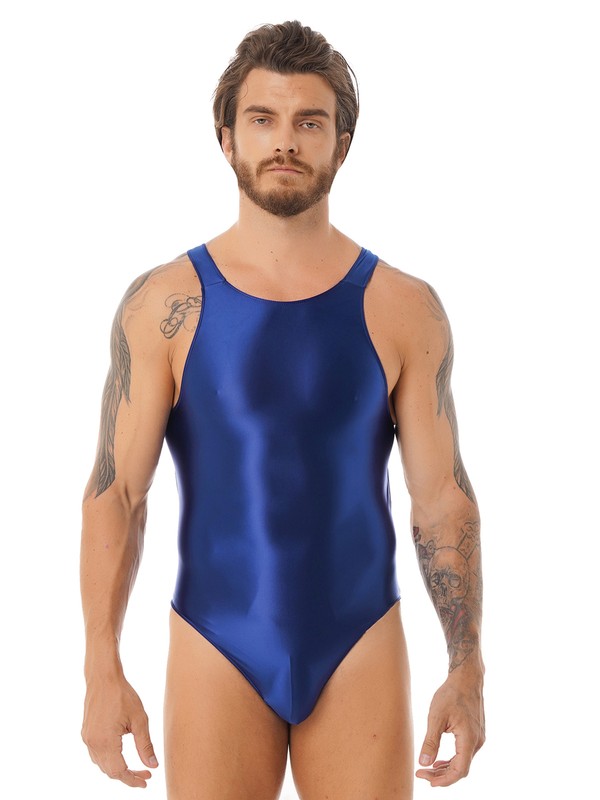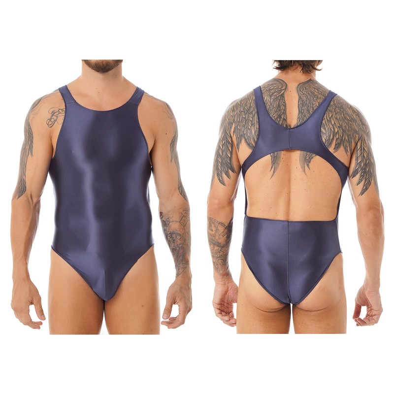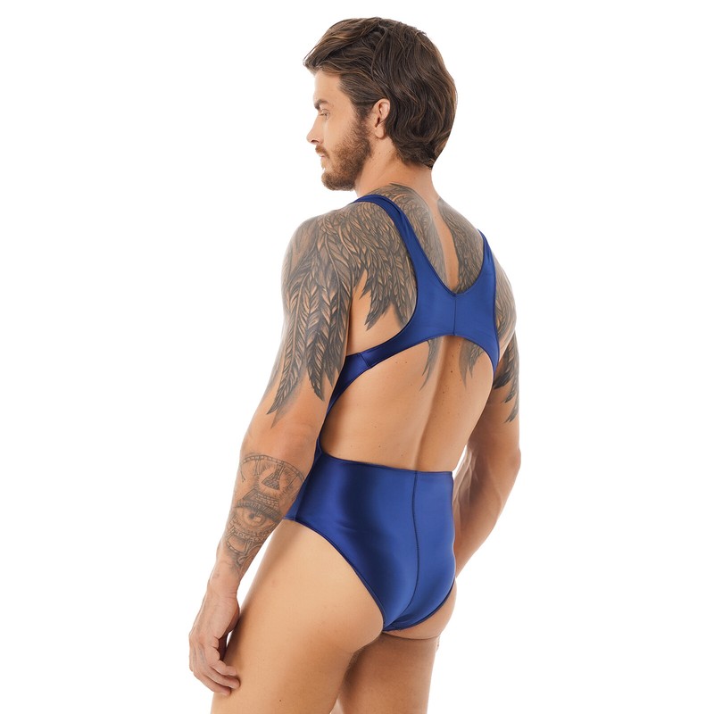 Mens Solid Color Glossy One-piece Swimsuit Cutout Back Bodysuit Leotard Swimwear.