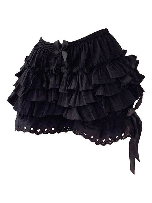 Tiered ruffled design, bowknot decoration. Heart-shaped hollow out pattern decorated at the hem of bloomers. It’s really cute.
