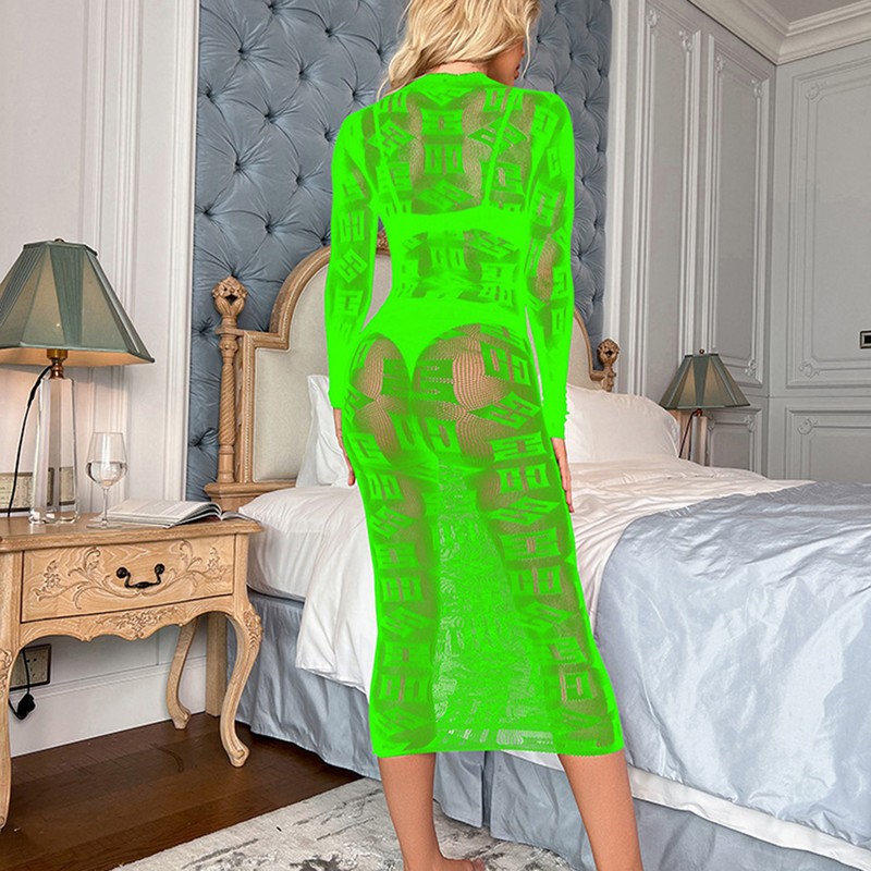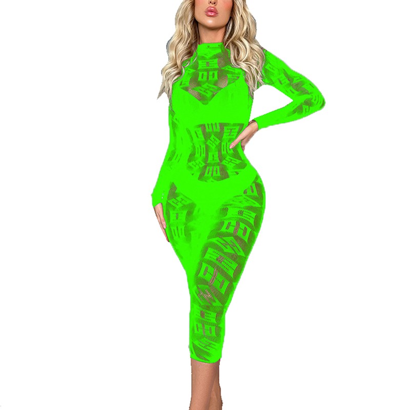 Womens Stylish Print Sheer Mesh Bodycon Dress See-through Long Sleeve Crew Neck Dresses.