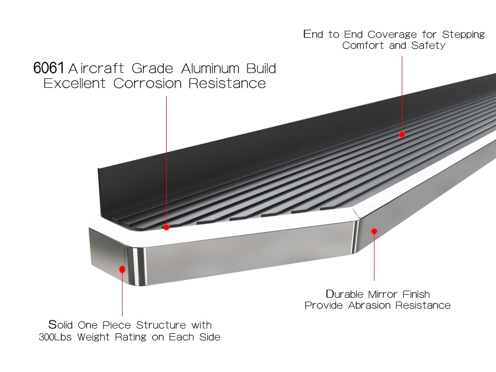 - Made of aircraft grade T6061 aluminum, these steps offer better corrosion protection than other mirror polished nerf bars