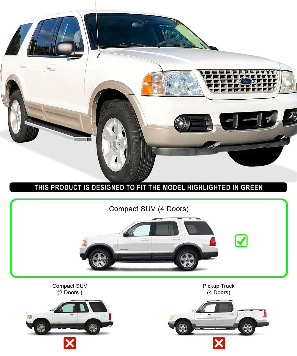 - Cab length Rocker Panel Mount and fits: 2002-2005 Ford Explorer / Mercury Mountaineer 4-Door (Excl. Sport Model)
