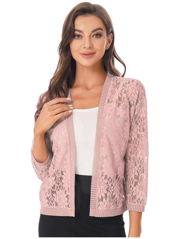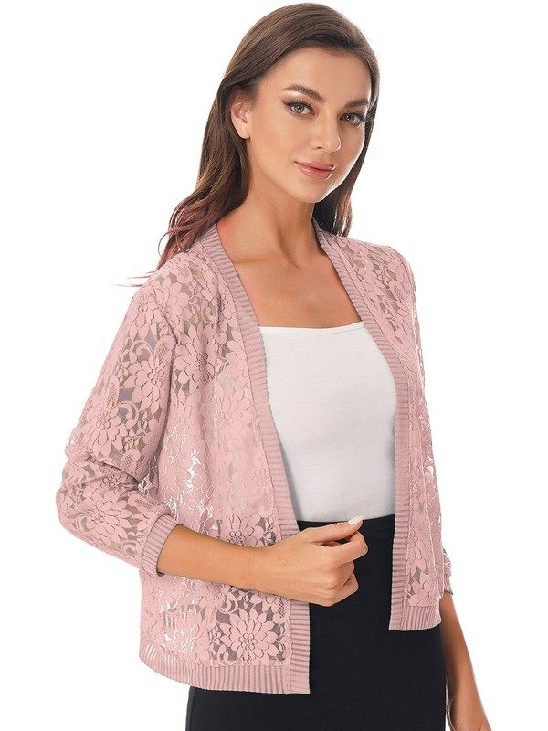 The lightweight cardigan features with 3/4 sleeve, open front, ribbed hem and collar, hollow floral lace design and pure color, making you stylish and charming.