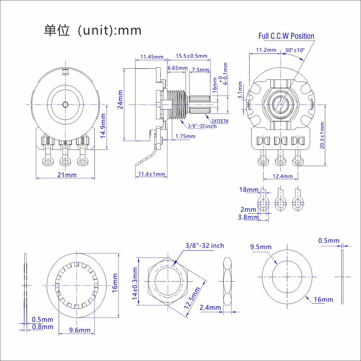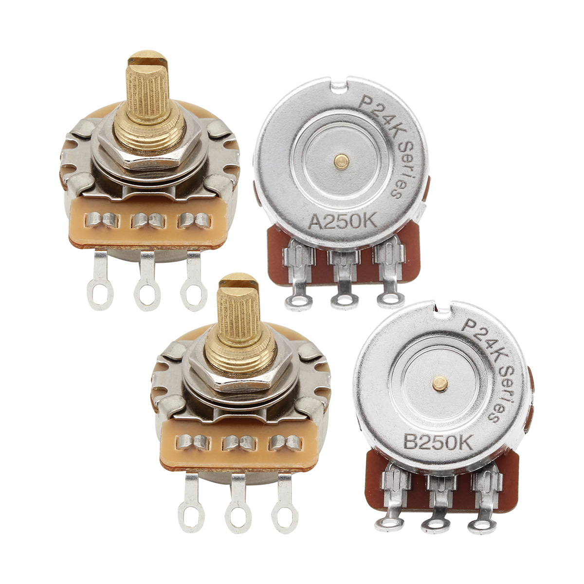 Features: Pack of 4PCS Guitar Pots Perfect for electric guitar/bass building, for pickguard/control plate mounting. Short shaft (15.5mm) pot, whole shaft made of brass material, longer-life use, gives you a smoother and more accurate response. 24-Tooth Split knurled shaft diameter 1/4" (6mm), thread shaft diameter 3/8" (9.5mm). Low torque and low noise smooth feel.with standard ±20% resistance tolerance. Each pot includes a flat washer, lock washer, and a hex mounting nut for custom height adjustment on a pickguard or control plate. Usually, 500K pots are standard controls for humbuckers, and 250Ks are usually used for single-coil pickups. Specification: Resistance: 250k ohms / 500k ohms for option. Type:A Type(Audio Taper) / B Type (Linear Taper ) for option. Shaft Diameter: Approx.6mm (1/4"). Threaded Shaft Diameter: Approx. 9.5mm (3/8" ). Shaft Length:15.5mm. Base Size: Approx.24mm. Size Details, please check the picture. 🎸Tips: 🎸Audio Taper (A) increases or decreases in a sloped curve fashion; Linear Taper (B) increases or decreases in a linear fashion; Audio Taper (A) are always used as Tone and Linear Taper (B) are always used as Volume, but you can use Audio Taper as Volume and Linear Taper as Tone as well, it usually depends on your personal preference. Package Includes: 4 x Guitar Pots