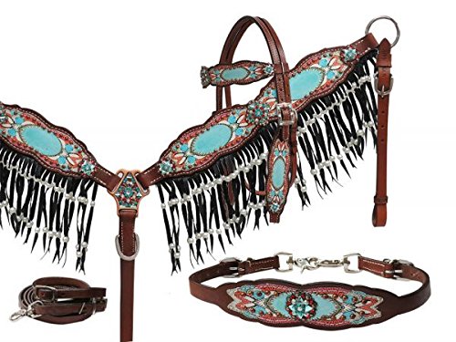 Showman Antique Inspired Print Overlay Headstall, Breast Collar & Wither Strap Set w/ Pearl Fringe. This set features medium oil leather with an antique inspired design print overlay accented with copper studs and bejeweled conchos and hardware. Breast collar features black textured leather fringe with pearl beads. Headstall comes with leather competition reins with conway buckle and swivel snap end. For an average full size horse.