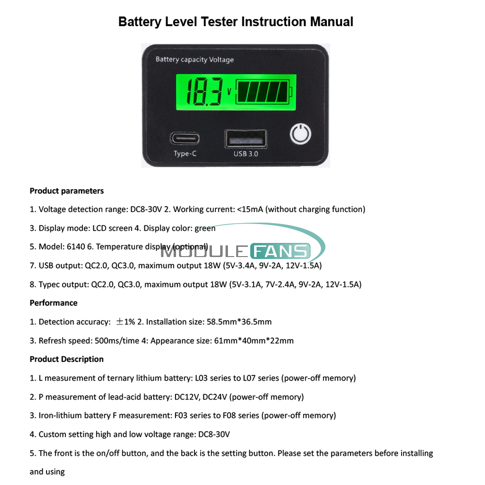 8. Typec output: QC2.0, QC3.0, max output 18W (5V-3.1A, 7V-2.4A, 9V-2A, 12V-1.5A)