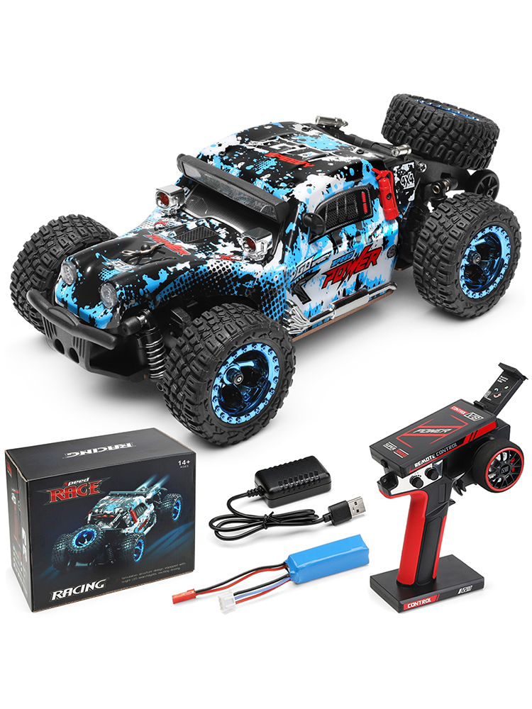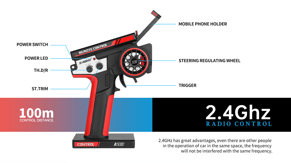 3.Off Road RC Car: 2.4 GHz Radio System with Anti-jamming capability allows to race at the same time in the same track. 100 meter control distance, Racing freely
