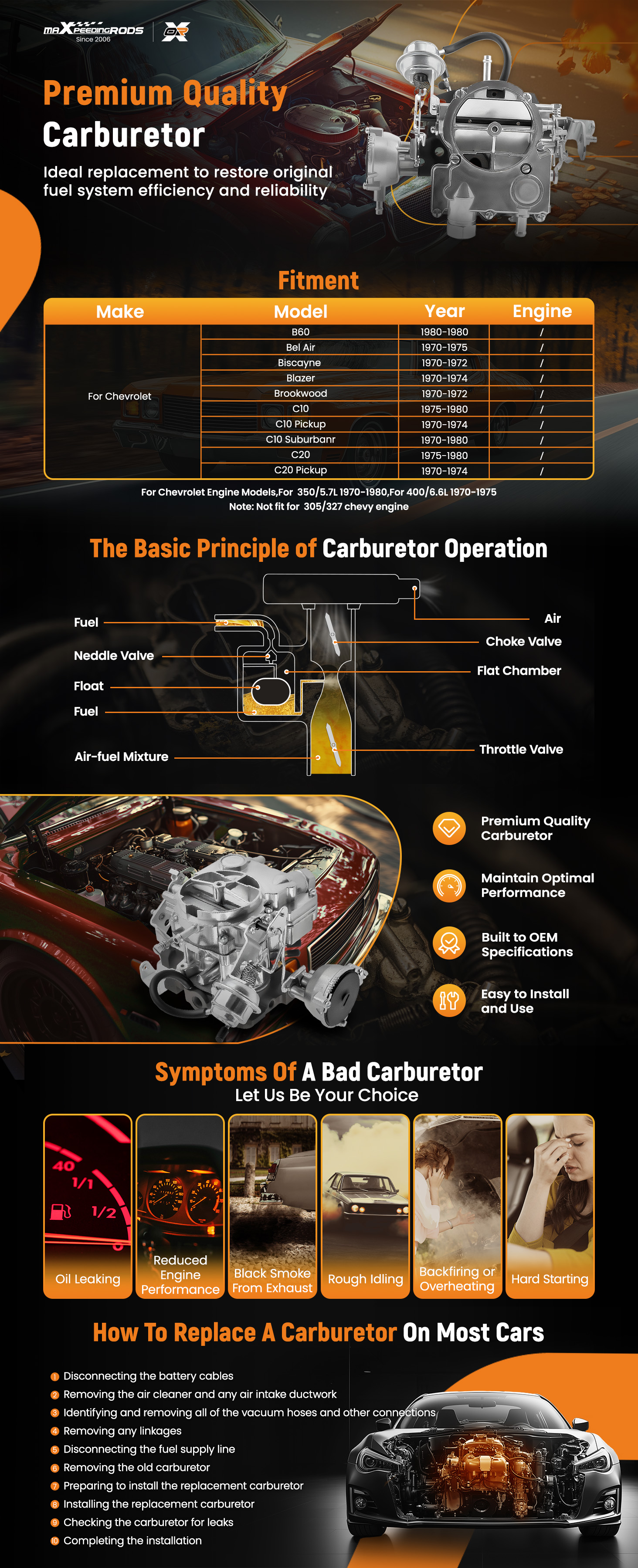 1. Premium Material: The carburetor for Chevrolet was made of high quality Zinc Alloy. Add more horse power while maintaining near stock fuel mileage.