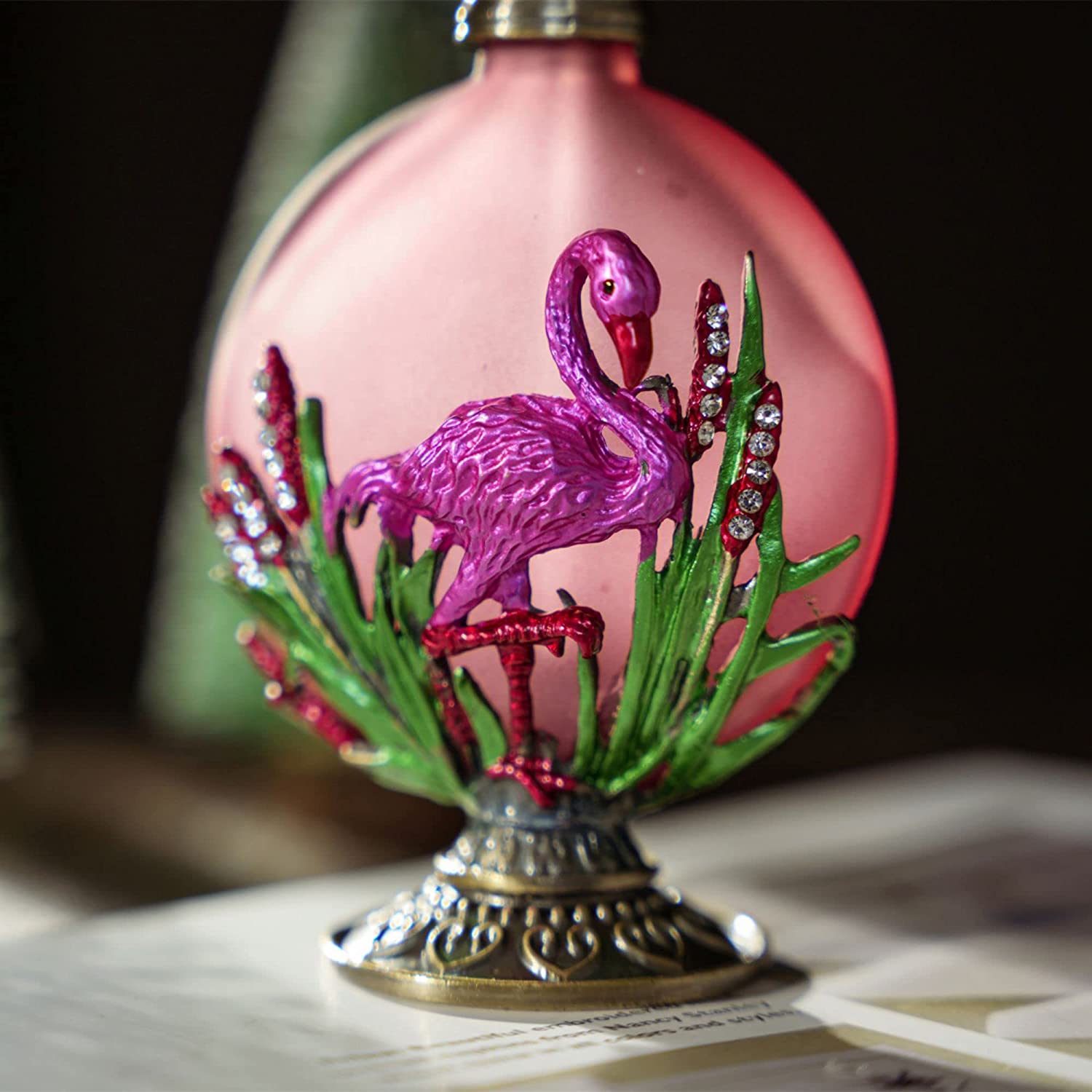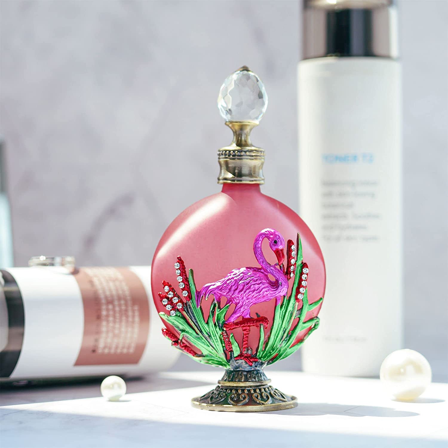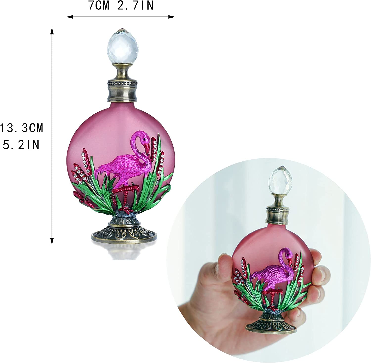 Vintage perfume bottle: Glittering rhinestones bejeweled and pink flamingo decorated glass perfume bottle with international-grade polishing process as well as exquisite spray color enamel,suitable for personal use,collection or delivery