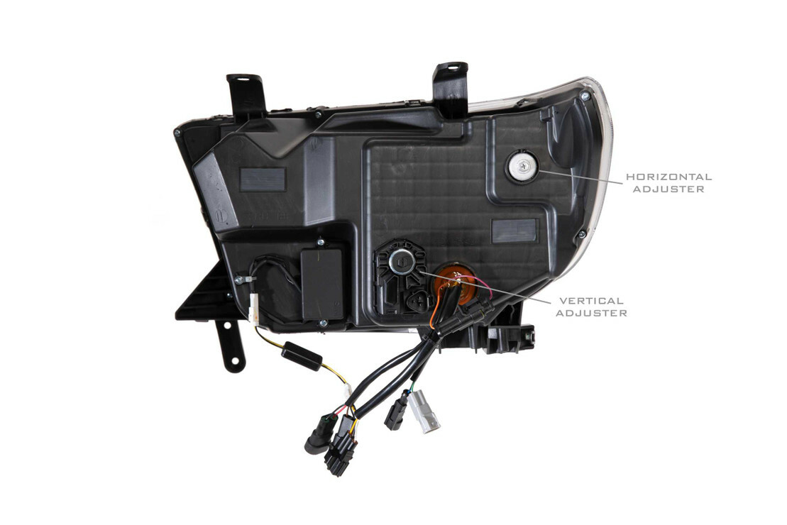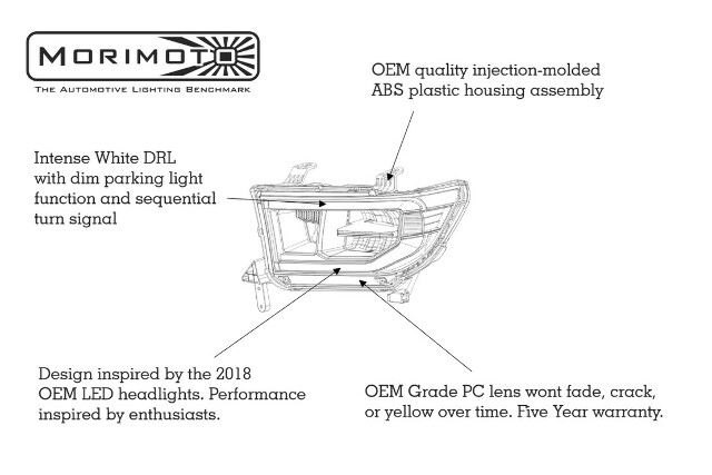 No Substitutes: If you're still running oldschool halogen headlights on your Tundra, then you're just behind the times! Thankfully the new Morimoto XB LED headlights: Look great. Are well-built. Have a virtually infinite life span. An unbeatable warranty, and out-perform the alternatives. Easily making them the best LED headlights on the market today for the Tundra aftermarket OEM Plus: While the Tundra LEDs from Morimoto cost a bit more relative to other options in the aftermarket; as the saying goes "you pay for what you get". We've seen it all, and their fit and finish is far superior to everything else out there. Guaranteed. Performance: We've always been blown away by the fact that the other brands don't even consider how well their headlights perform on the road at night. Most often, they're a downgrade compared to even the standard halogen setup, and that's a shame. The good news is that Morimoto's XB LED headlights produce a well defined beam pattern with a great amount of width, intensity, and a proper distribution of light. DOT Approved: Make no mistake, these will produce a much different [better] result than slapping some LED replacement bulbs into your stock housings. Their LED-specific reflector optics meet & exceed all SAE, DOT, and FMVSS108 regulations when aimed properly... and that's easy to do with their integrated vertical/lateral adjusters. Plug-n-Play: Wiring is easy too! The LED headlights are designed to work on your Toyota Tundra without any modifications. They will plug into the factory connectors for the stock headlights and each assembly includes all necessary connectors, rubber seals, and pigtails for a plug n play install. No error codes, no flickering, hyper-flashing, or radio interference. They can easily be removed, and will not void your factory warranty. Sequential LED DRL: Game Changer! Their LED daytime running light is powered by Osram 5000K LEDs and is insanely bright, easily visible during the day. A separate optic that's dedicated to the turn signal function uses amber LED's to produce a full sequential turn signal. While that feature will cause others to mistake your truck for an Audi; for those who are a bit more traditional they can also be setup to run as solid on/off style signals too. Well-Built: Their UV-coated polycarbonate lens will resist the test of time, ensuring your truck's new headlights will look good as new for many years to come. The PPS plastic housing is light-weight and much stronger than comparable alternatives. The die-cast aluminum heat-sinks inside the housings provide more than an adequate amount of cooling for the OEM grade Osram LED chips that produce the light. These complete headlights may be new to the market, but Morimoto's XB LED fog lights have proven themselves perfect after 5+ years out now, which is confidence inspiring. They Look: Amazing. At least in our opinion! The subtle OEM-like elements incorporated in their design are more than enough to make them stand out, but they're clean enough to be considered top of the line original equipment to those who don't know any better. The piano black trim and smoked gray reflectors keep the color scheme neutral for any color truck.