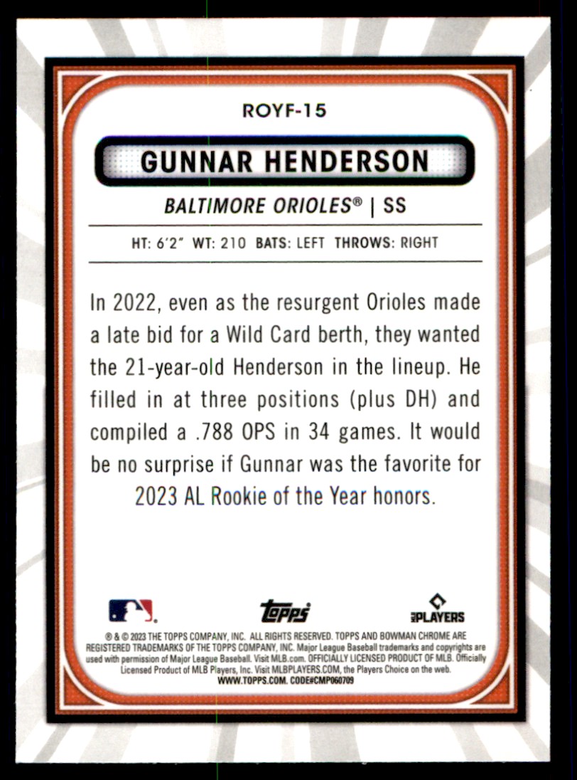 | 2023 Bowman Chrome Rookie of the Year Favorites GUNNAR HENDERSON # ROYF-15 RC | ||||||||||||||