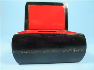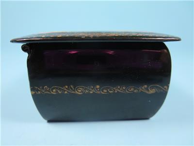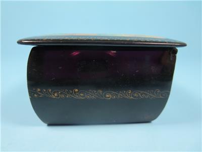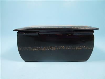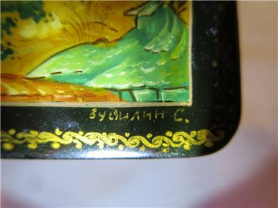 Mstera lacquer boxes are normally signed with gold in the margin between painting and border. They include the artist's name, village name, and frequently a title, but are rarely dated. This box has a bright red lacquer interior.