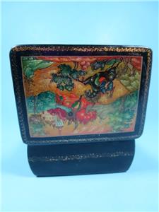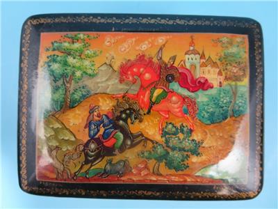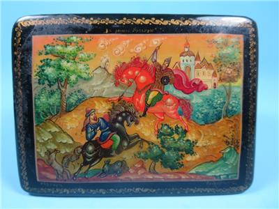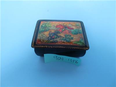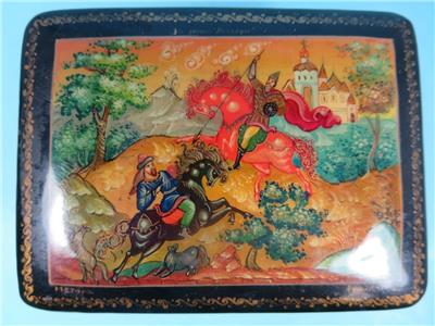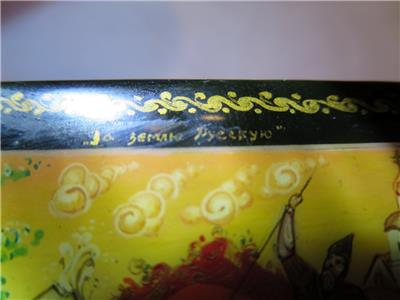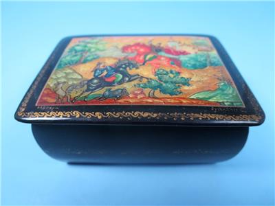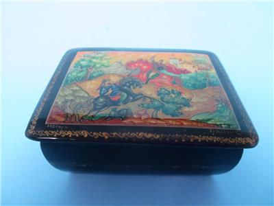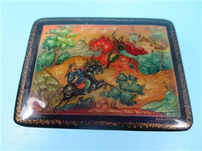 Offered is a small, hinged, signed Russian lacquer miniature was handcrafted in the Village of Mstera (Мстёра). The scene on this box represents the Battle of Kulikovo. The name of the scene on the box is "For Mother Russia". It depicts two men on horseback in a battle to the death. Alexander Peresvet, (also spelled Peresviet (Russian: Александр Пересвет)) was a Russian Orthodox Christian monk who fought in a single combat with the Tatar champion Temir-murza (known in most Russian sources as Chelubey or Cheli-bey) at the opening of the Battle of Kulikovo (8 September 1380), where they killed each other.