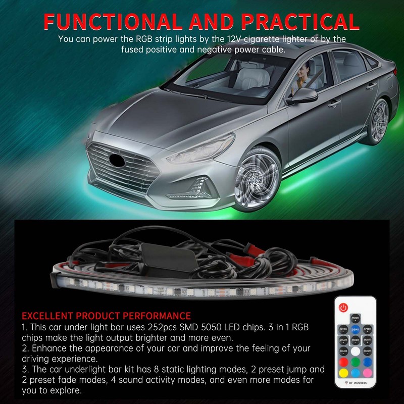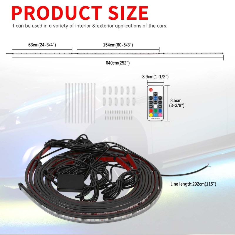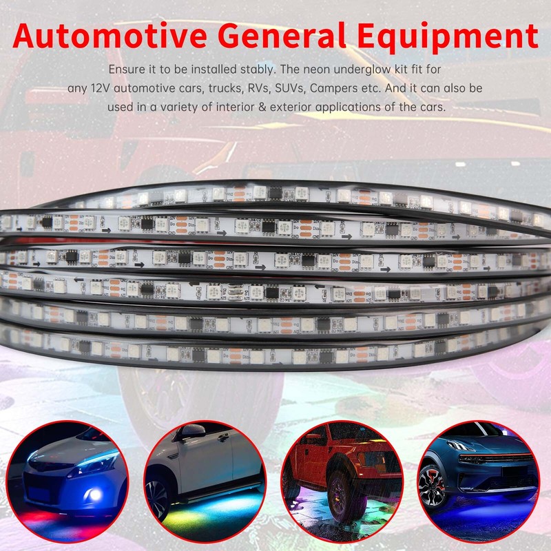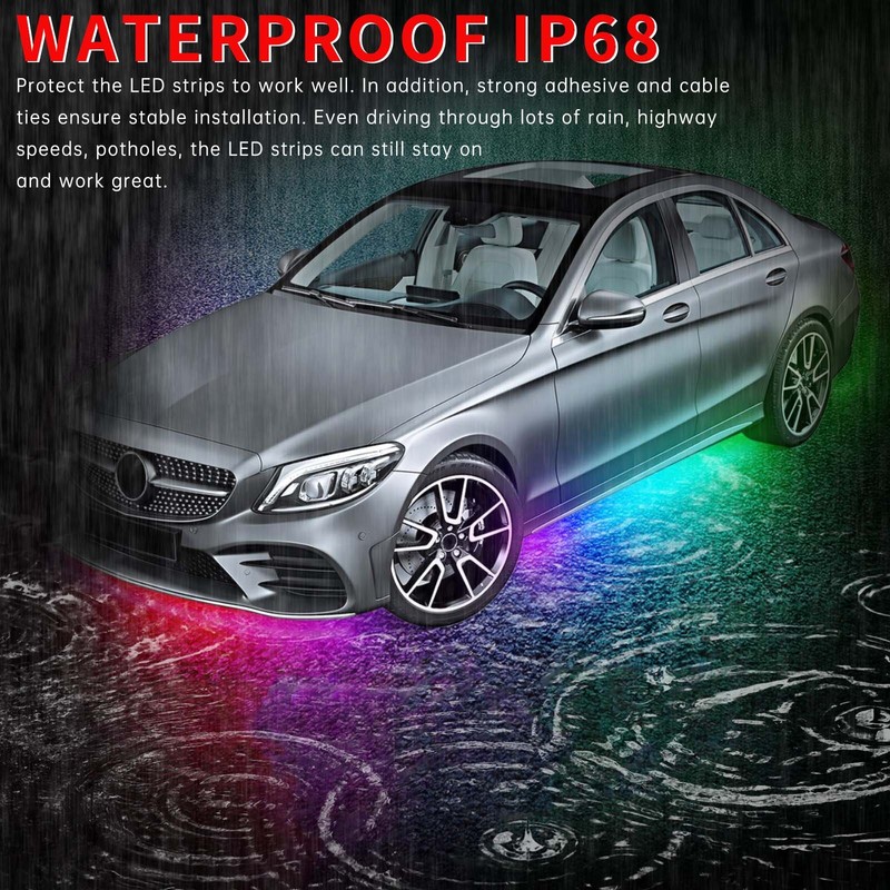 High Brightness LED Chip: High-intensity SMD 5050 LED chips. 3 In 1 RGB chip, brighter output, uniform lighting. Enhances the look and feel of your vehicle with brilliant lighting effects. Made of flexible rubber tubing, protected from road conditions and debris. It can be bent freely and has the characteristic of high and low-temperature resistance. Waterproof.